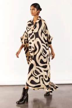 Indulge in the allure of the Matte Black Silk Kaftan Dress. Embracing free size elegance & sequin detail, it becomes a universal canvas of sophisticationùa poetic chapter in your sartorial journey, where each wear tells a tale of timeless allure.