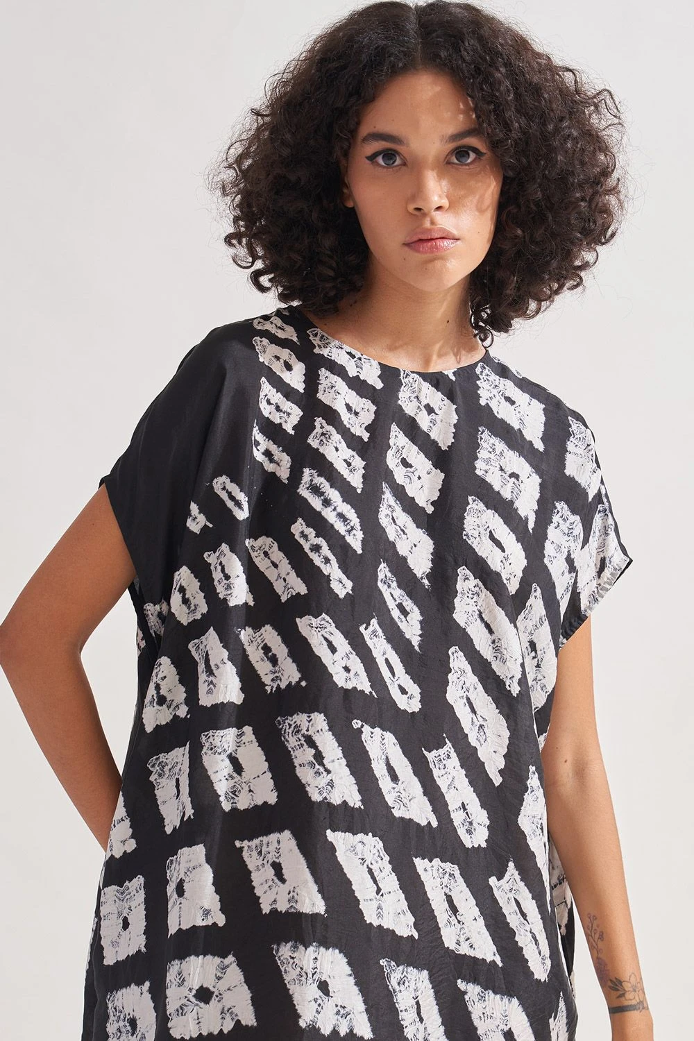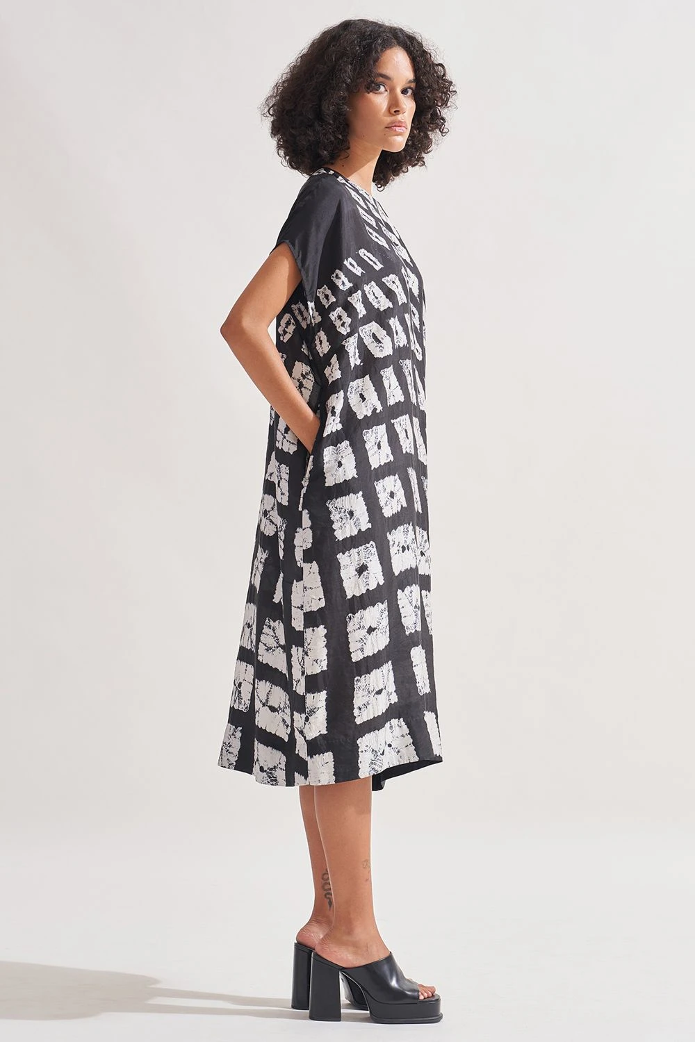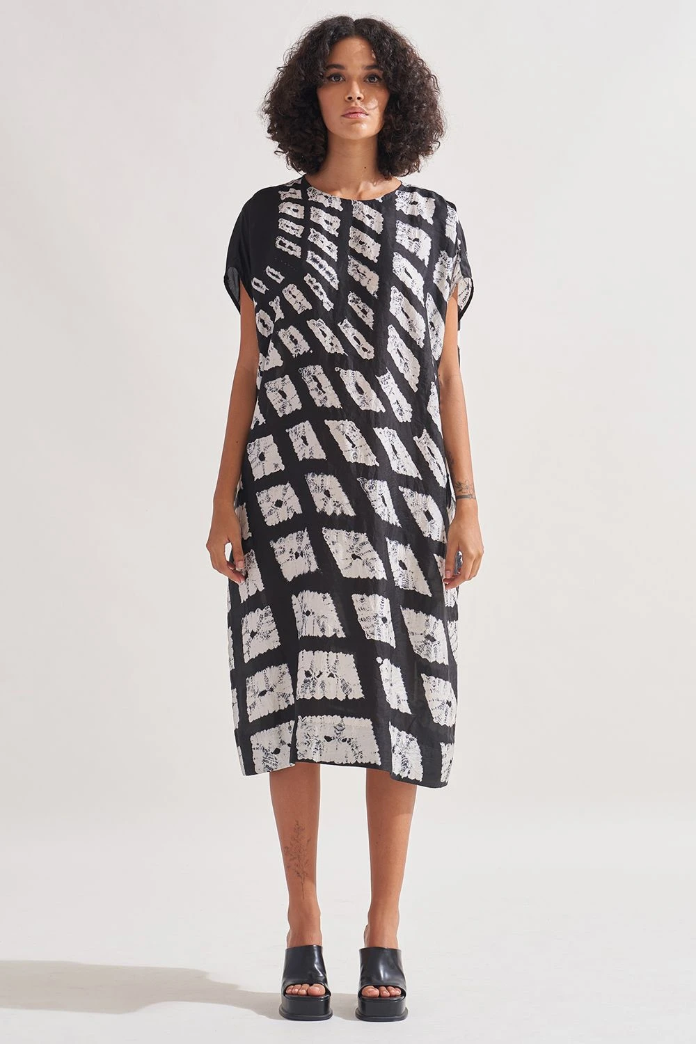 Indulge in the luxurious charm of this hand-woven silk dress adorned with meticulously hand-crafted engineered shibori patterning. The round neck and the single button and loop fastened slit at the back create a sophisticated silhouette.