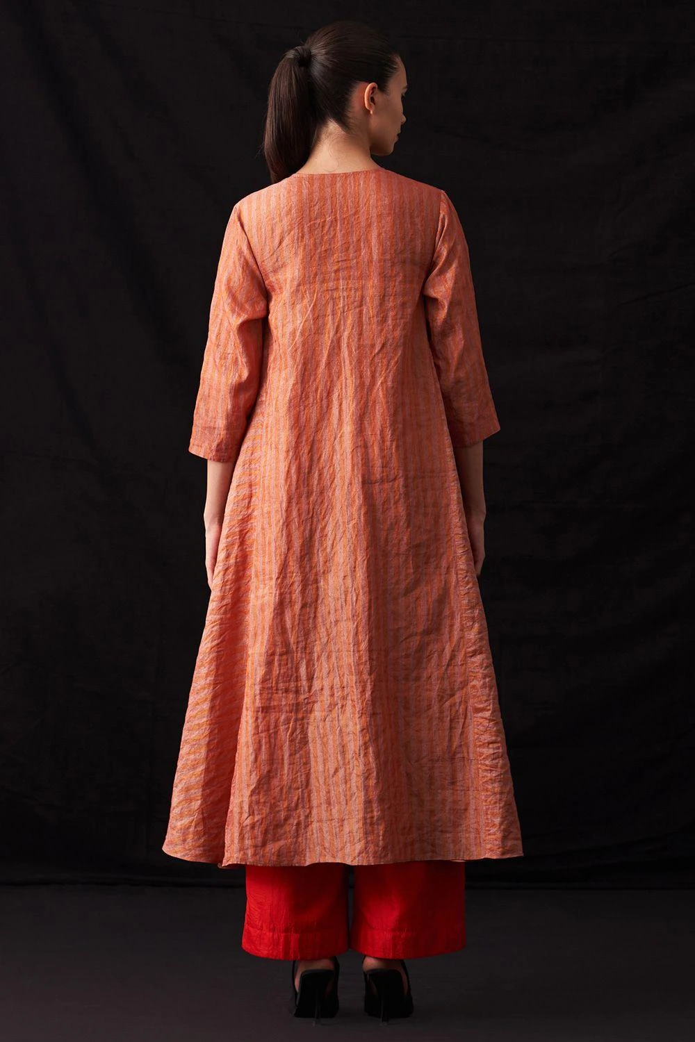 Drape yourself in sophistication with this subtle red hand-woven cotton-zari, metallic stripe dress. Perfect for cocktail parties or upscale dinners, it exudes elegance and style, ensuring you stand out in any glamorous evening affair.