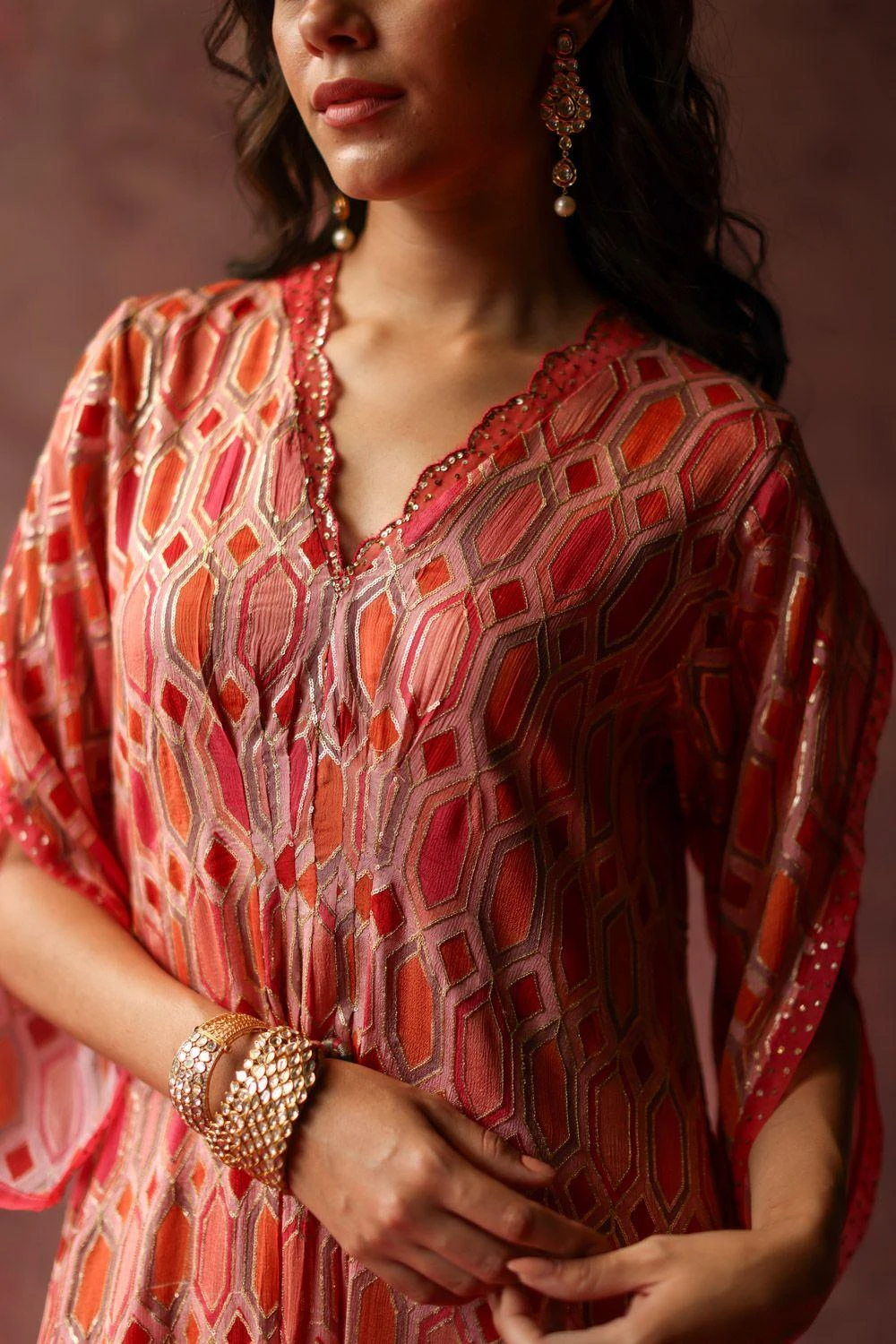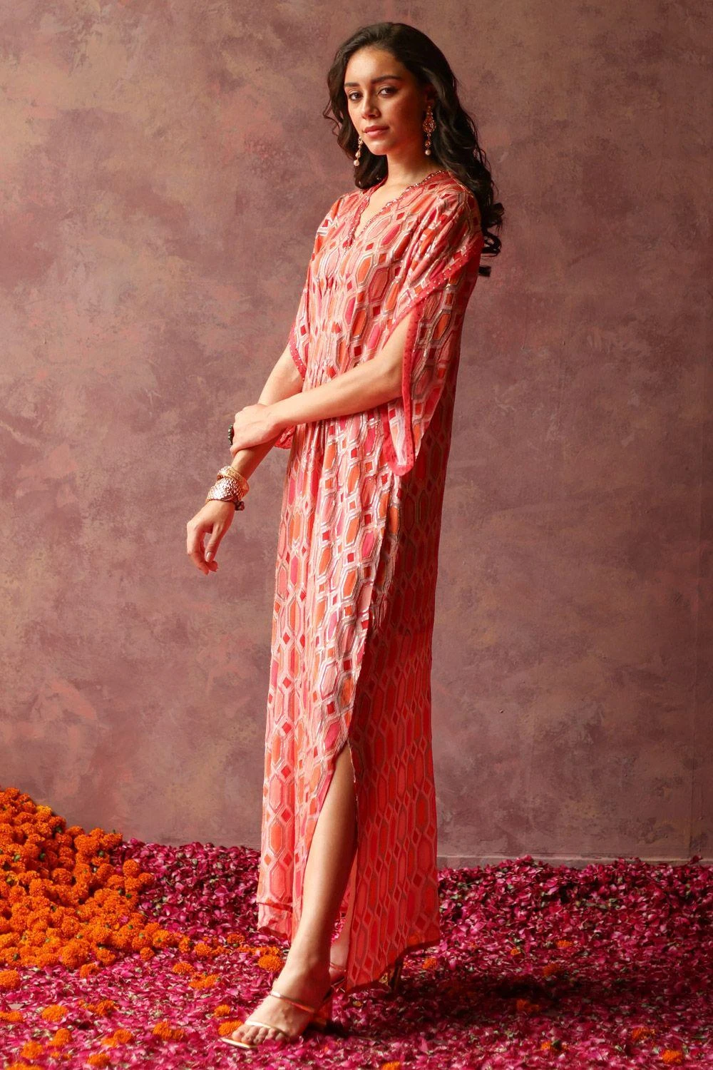Look effortlessly stylish with this kaftan dress. Crafted in georgette, this asymmetric kaftan features a V-neckline adorned with delicate organza scalloping and intricate sequin embroidery. It is offset with a coordinating slip.