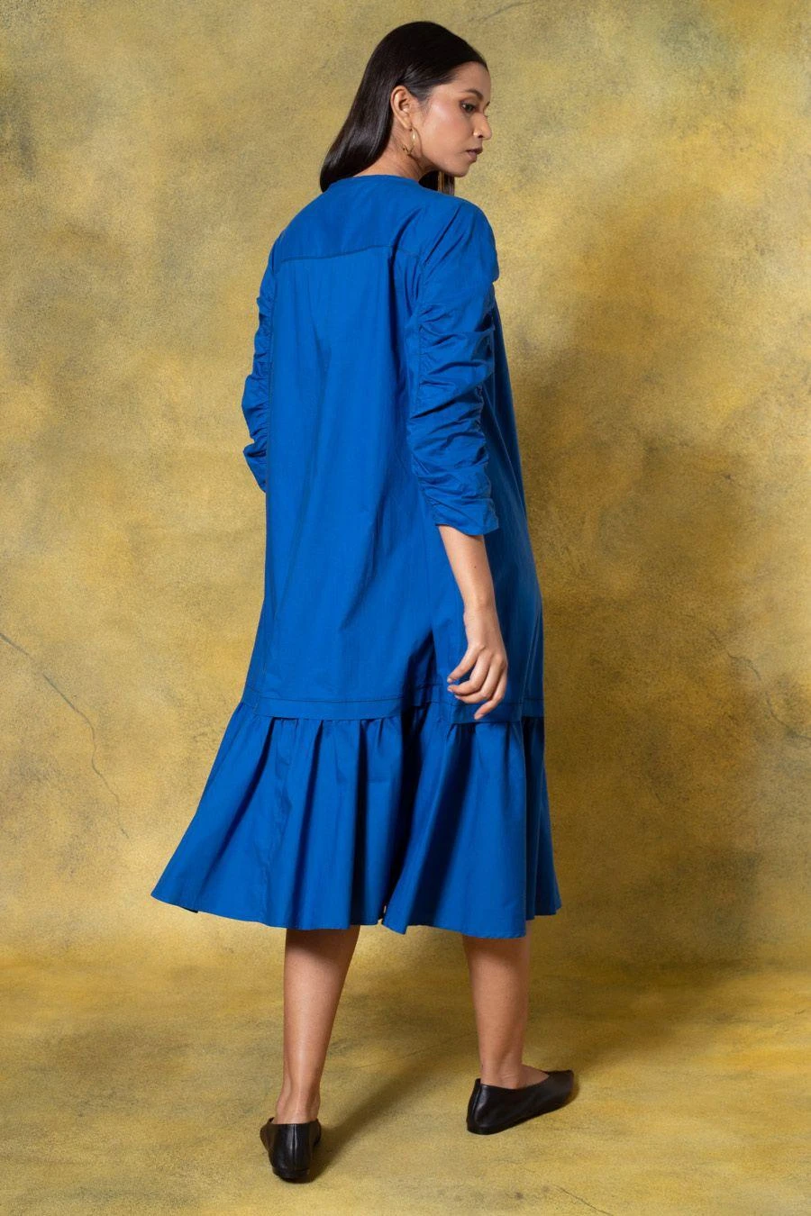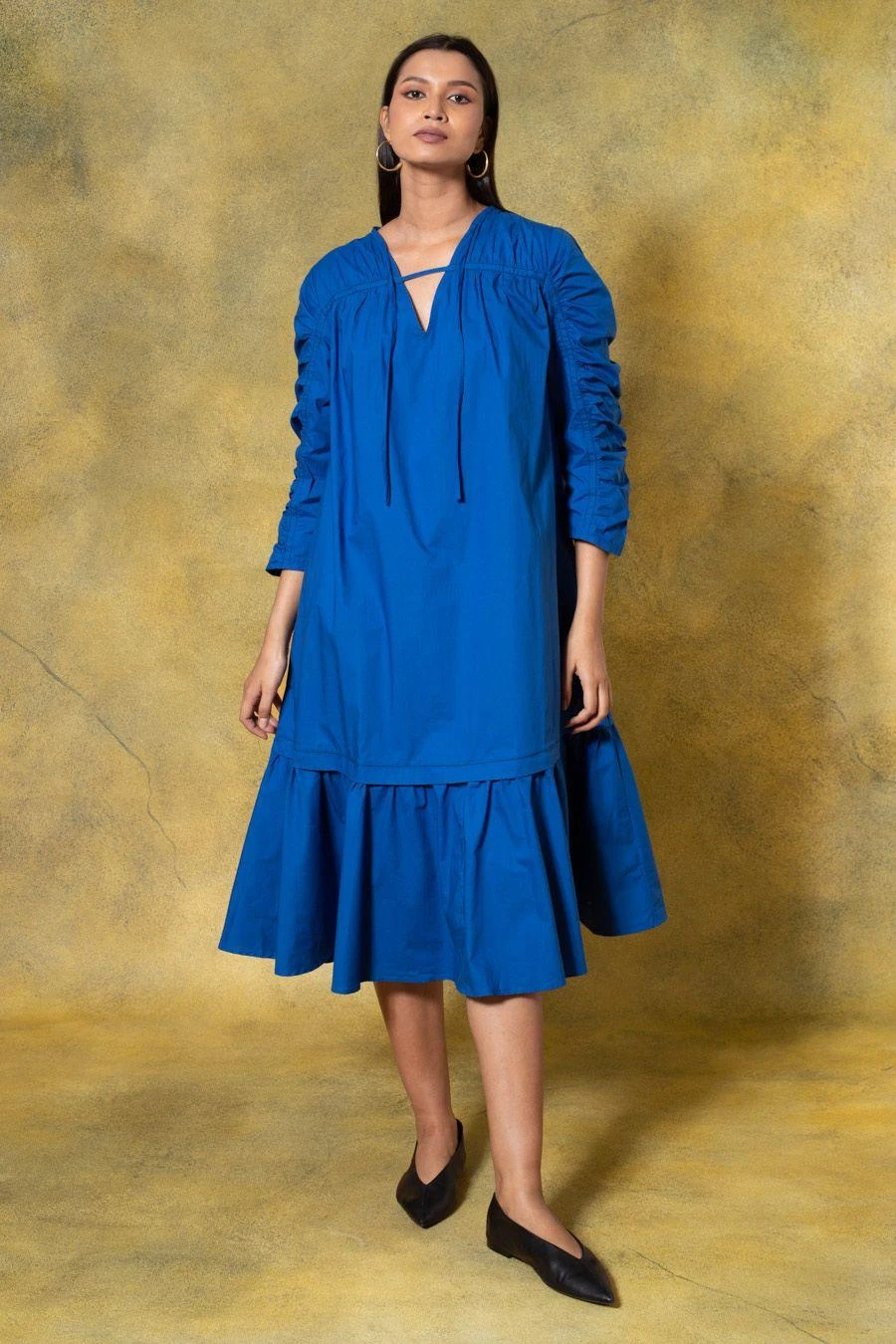 Look sartorially savvy with this blue A-line dress. Meticulously fashioned from eco-friendly kora material, this dress showcases a stunning design of intricate gathered details.