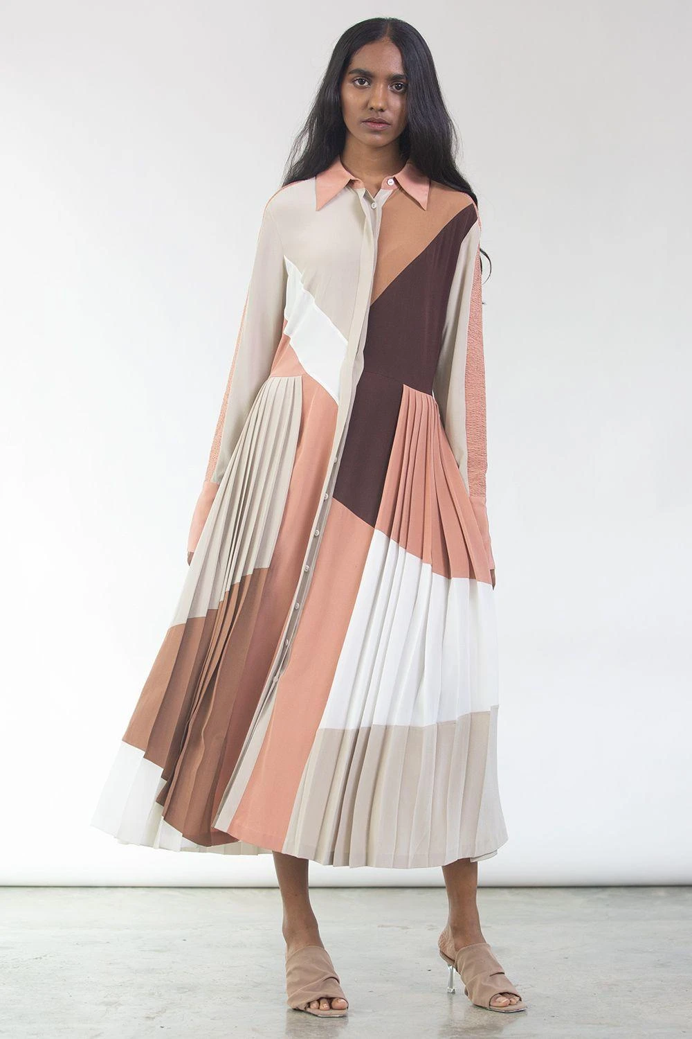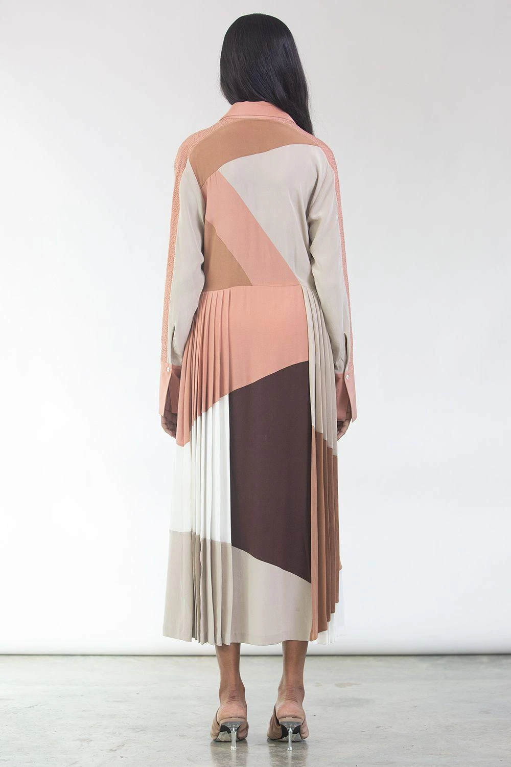 Geometric color block pattern and pleats at the bottom panel gives a unique character to this shirt dress. Wear it to office for an important meeting or to any formal occasion, it’s an effortlessly chic option.