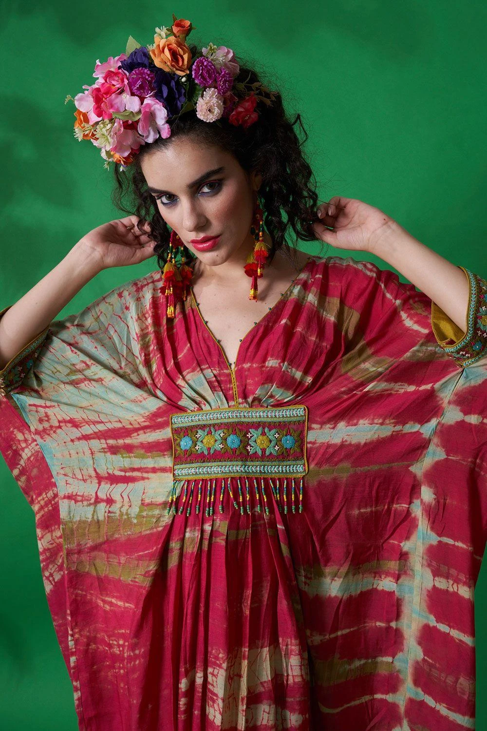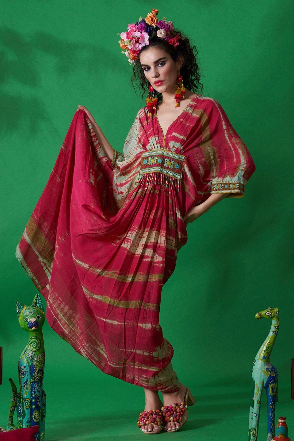 The perfect amalgamation of style & comfort, this dress is perfect for a day out. Cut in cotton silk, this tie dye kaftan dress features a pleated & embroidery details. Style this dress with dainty jewellery to complete the look.