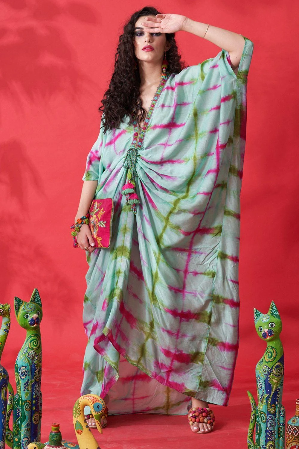 The perfect amalgamation of style & comfort, this dress is perfect for a day out. Cut in cotton silk, this tie-dye kaftan dress features a V neck, dori string & an embroidered neck. Style this dress with dainty jewellery to complete the look.