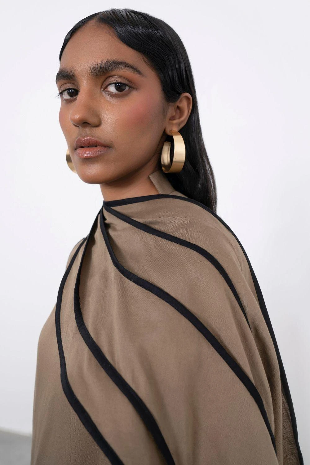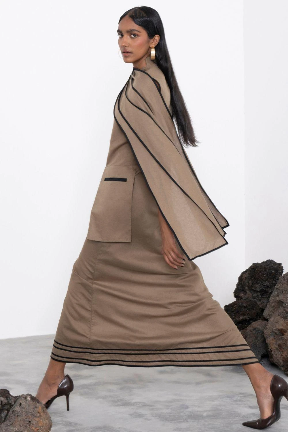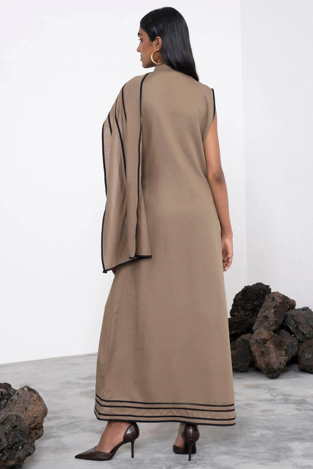 This beige long dress will keep you comfortable and stylish on those hot summer days. It is cut in linen with black outline details. It also features front patch pockets for utility and a scarf attached to the collar.