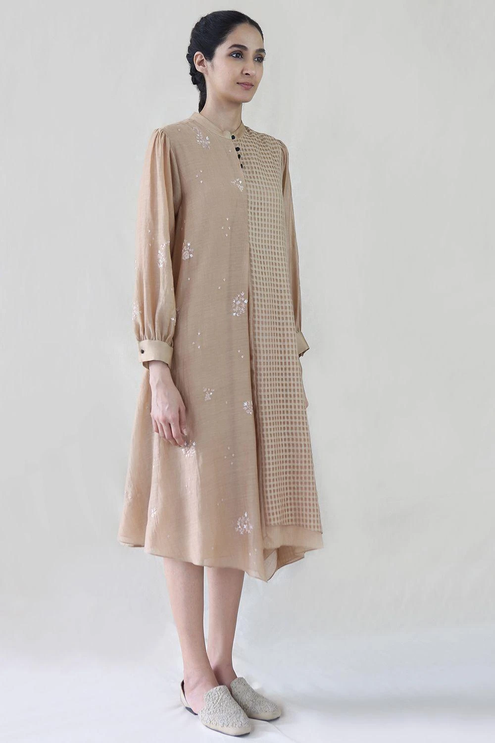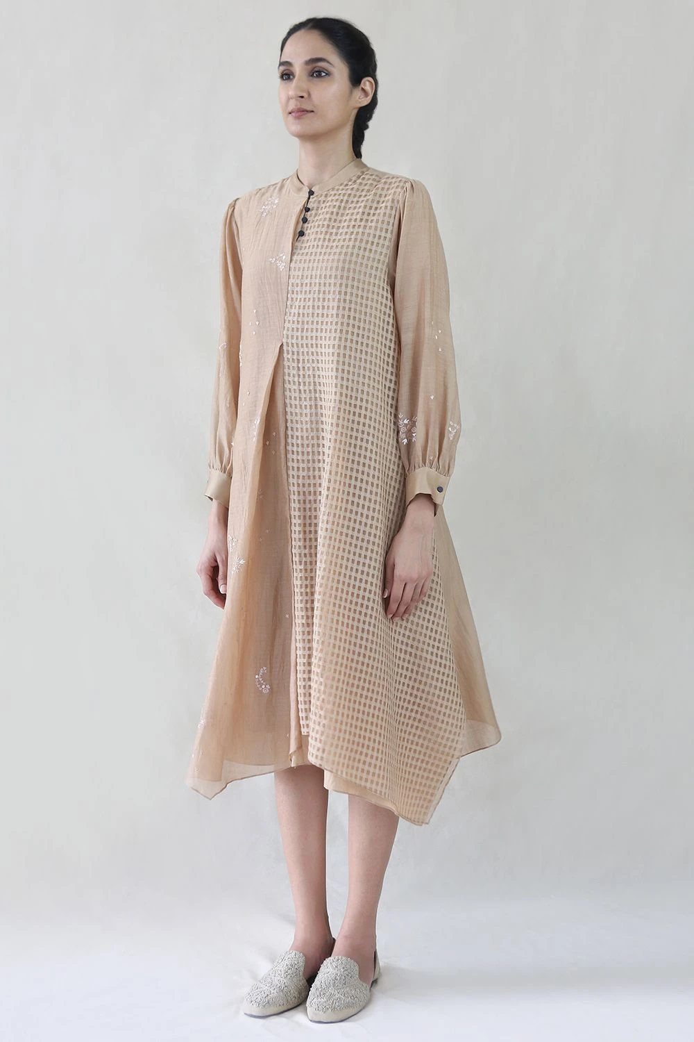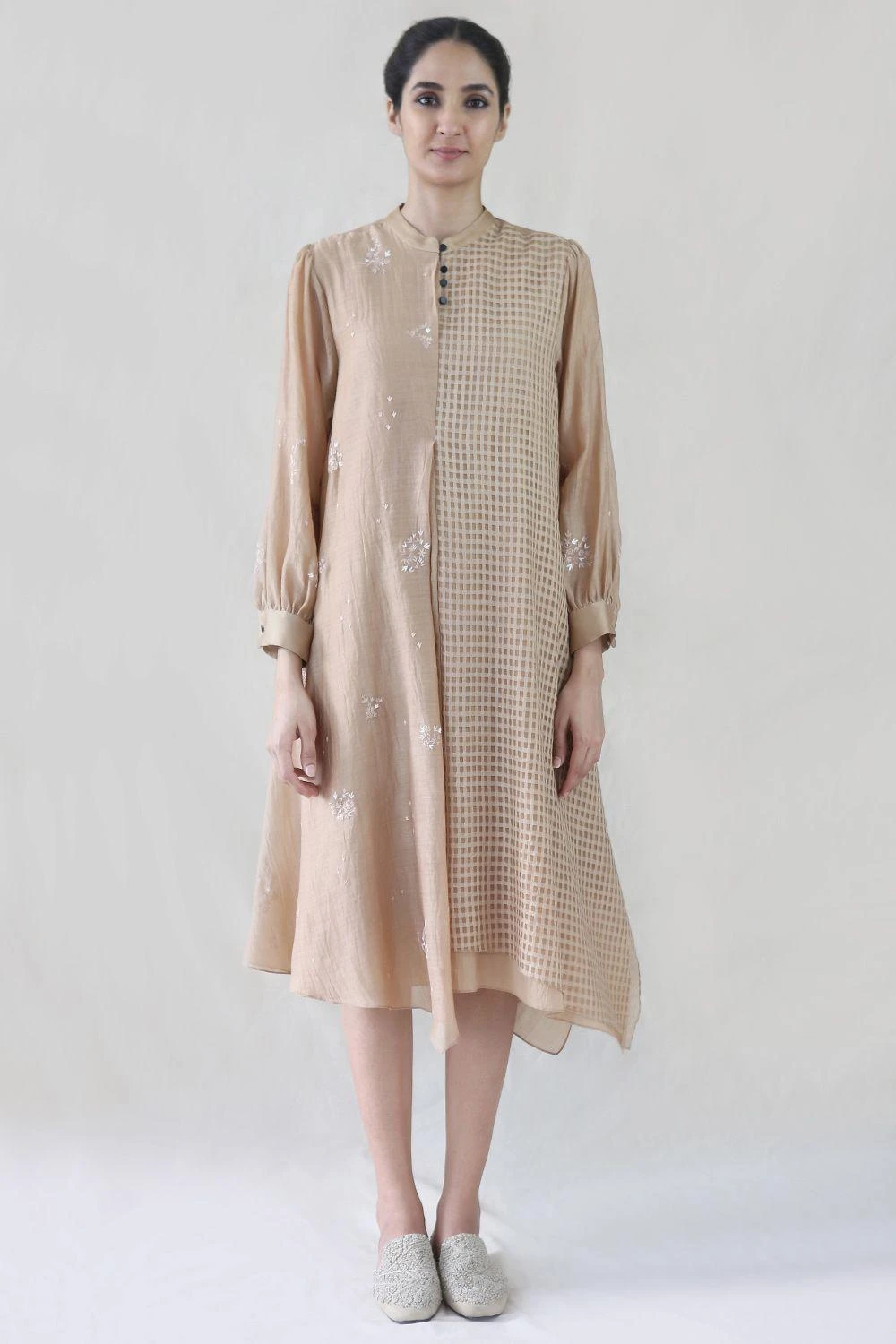 Tonal floral embroidery, checkered kota layer & asymmetrical hem – this dress is unique for its sartorial detailing. Pair it with textile scarf & woven flats for an uber-chic summer look.