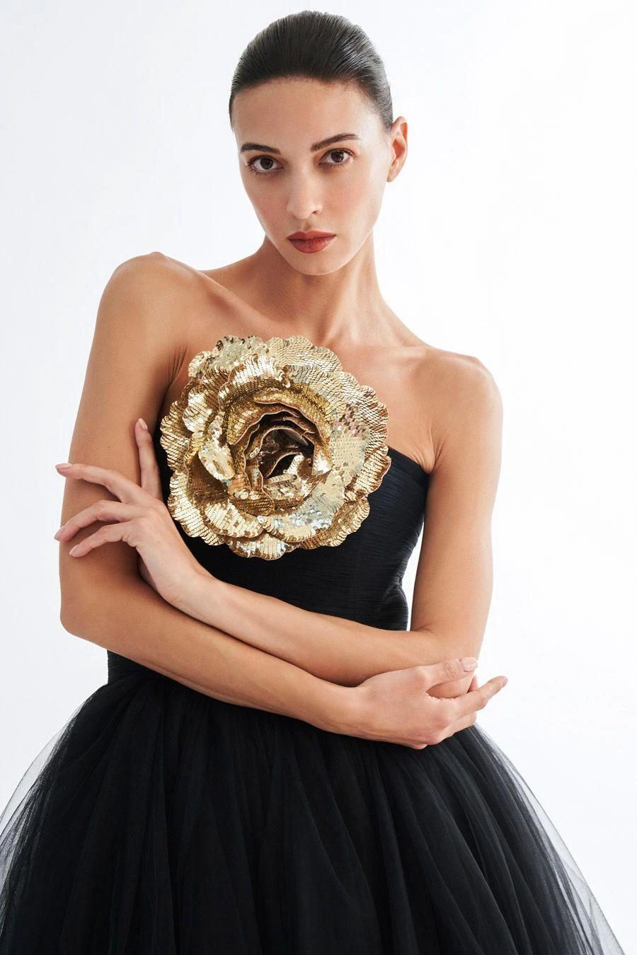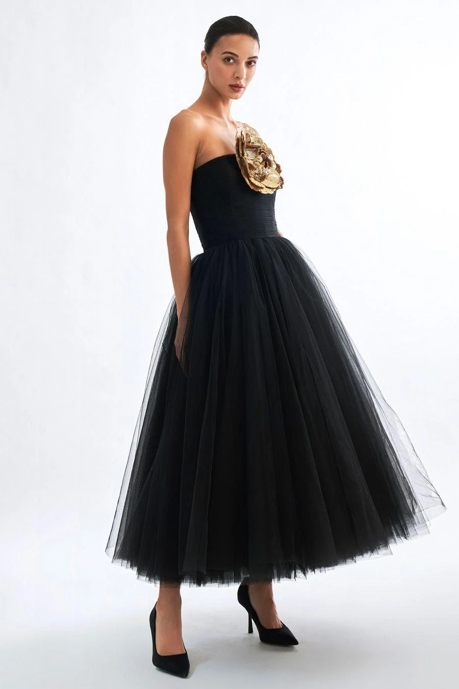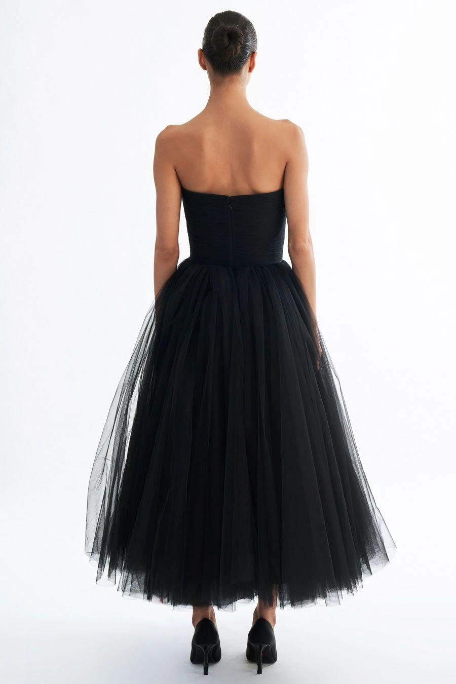 Indulge in the exquisite elegance of this strapless tube fluted draped Tulle midi dress. The captivating black hue exudes sophistication while the delicate draping and fluting add feminine allure.