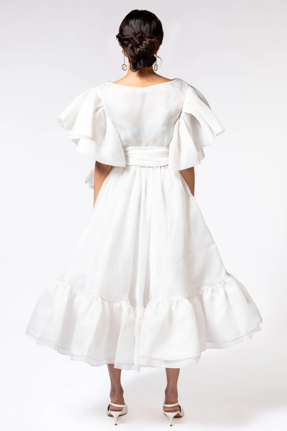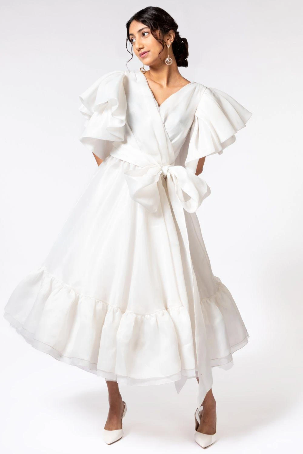 Look ethereal in this white wrap dress. It is beautifully made in sheer organza with playful bubble sleeves and side tie-up for a cinched look. Style it with a pair of elegant earrings for a daytime soiree.