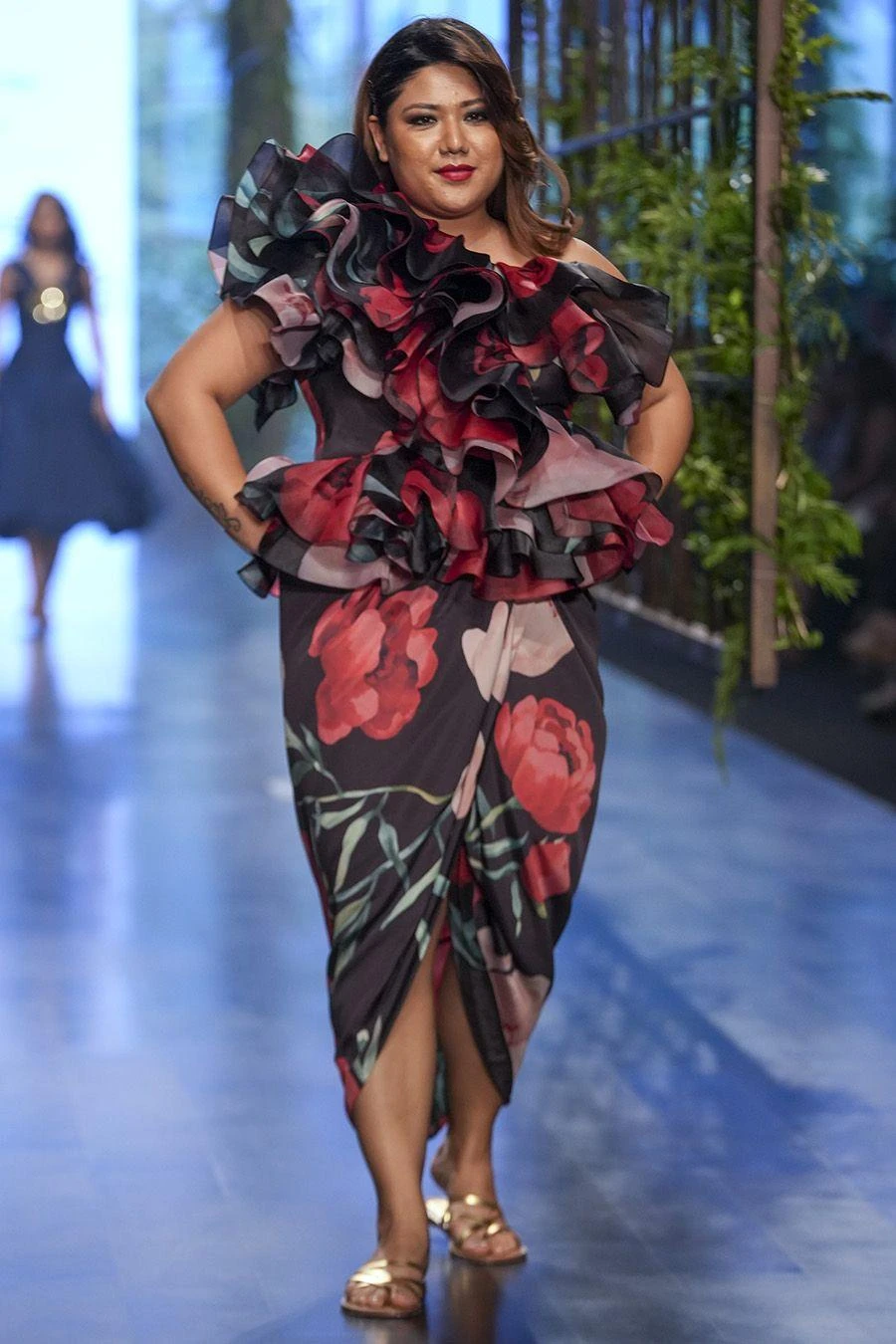 Prepare to bring on the ritz and glitz with this jumpsuit. Crafted in organza & French crepe, this one shoulder dress with a wrap around hem features a dramatic ruffled detail. Style it with a pair of statement earrings & heels to complete the look.