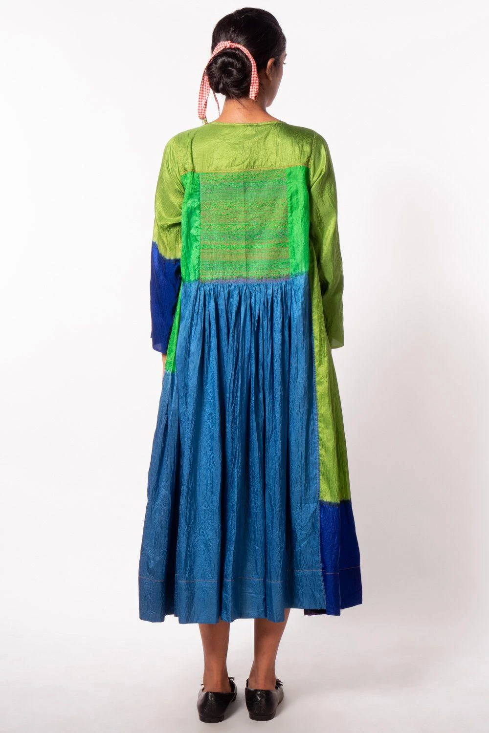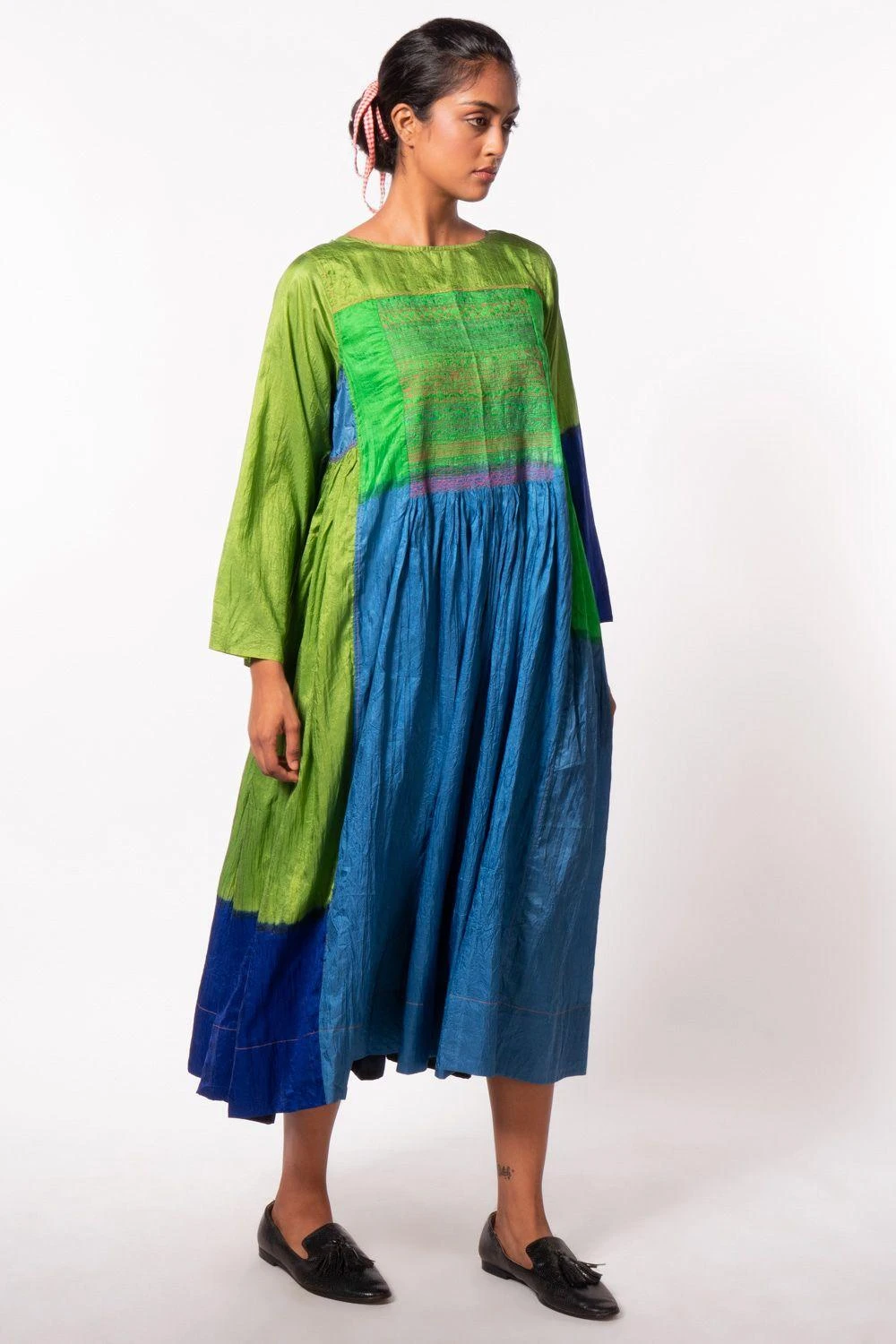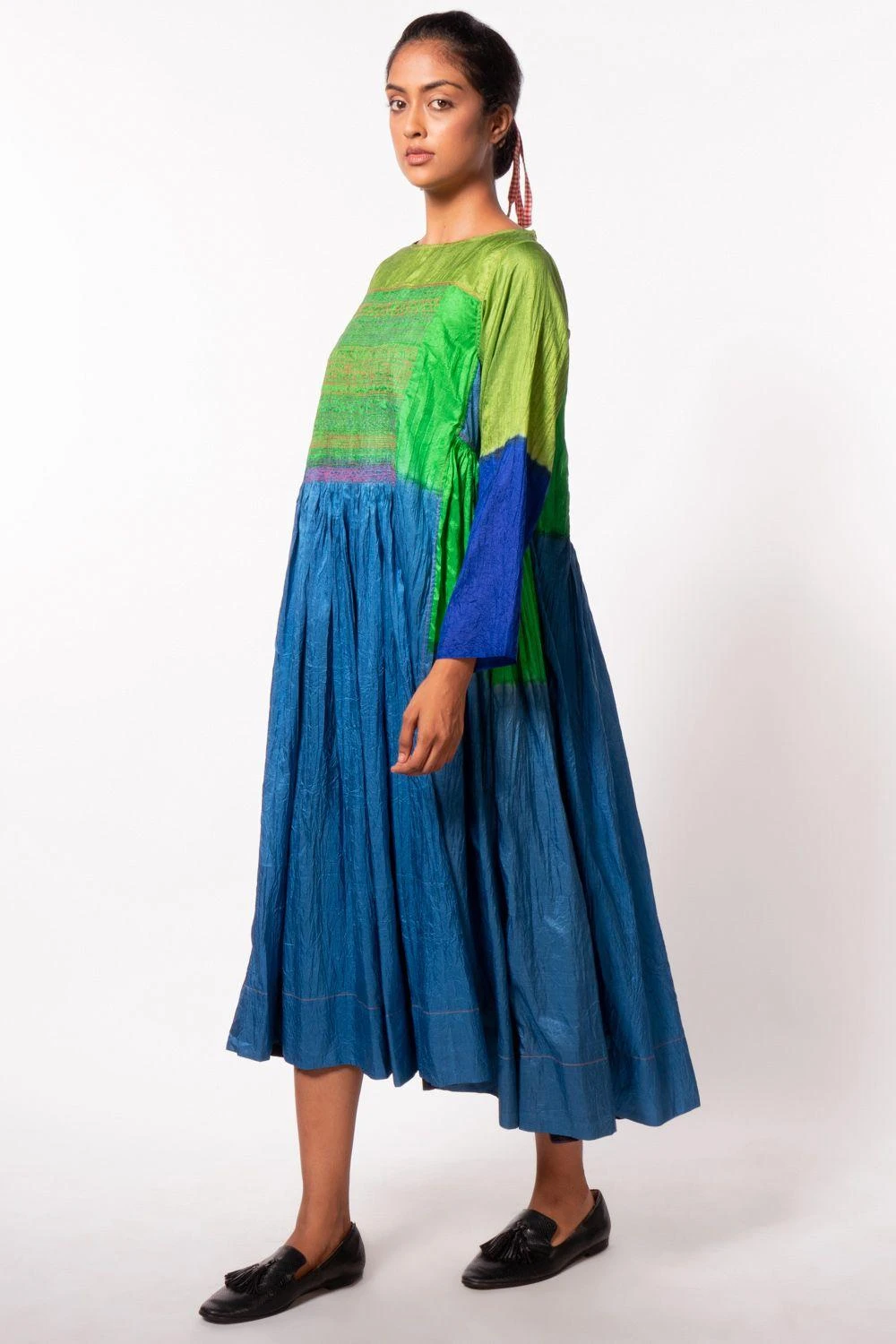 This ombre shaded green & blue dress is a versatile piece and can be dressed up or down, suiting your aesthetic. You can style it with a pair of cropped pants and silver jewellery for a dressy look.