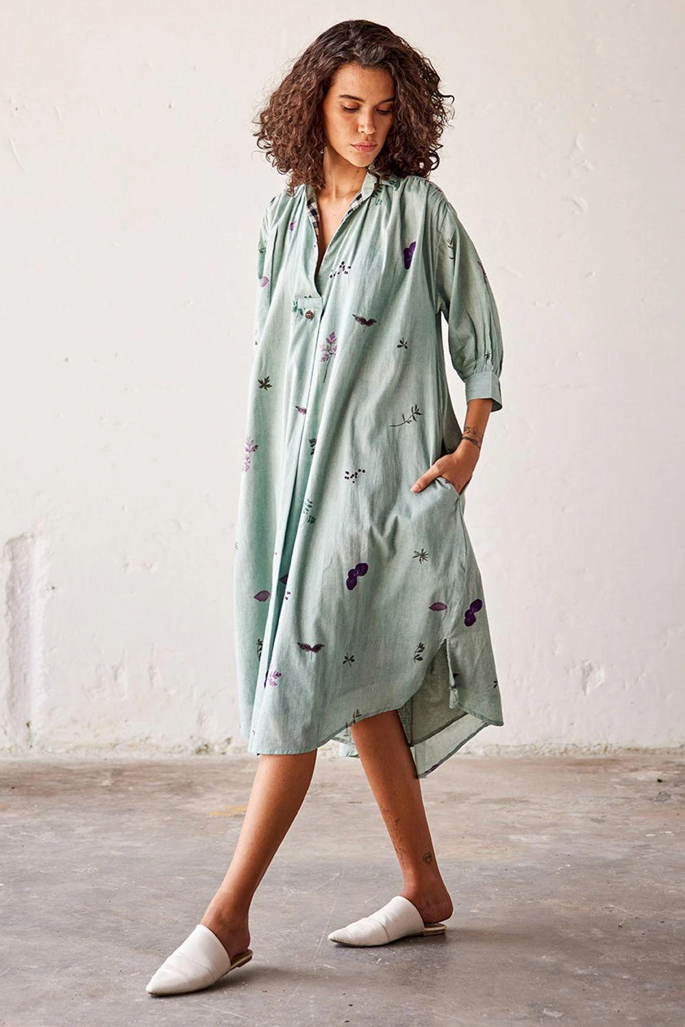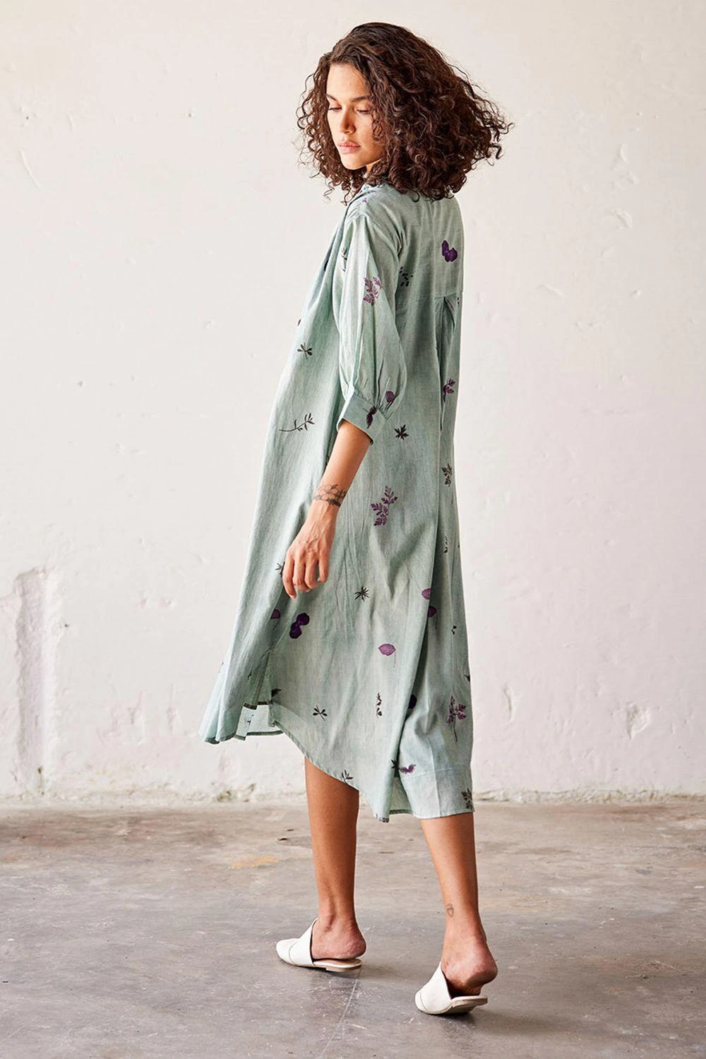 Elevate your style with this cadet blue dress. Adorned by an open collar and front button detailing, it features graceful gathers at the shoulder, buttoned cuff openings on the sleeves, & an elegant back pleat for a refined and sophisticated look.