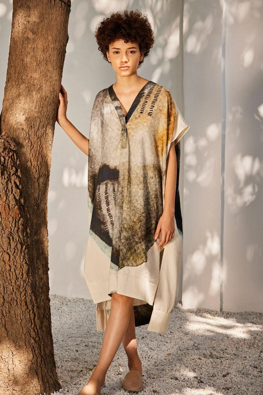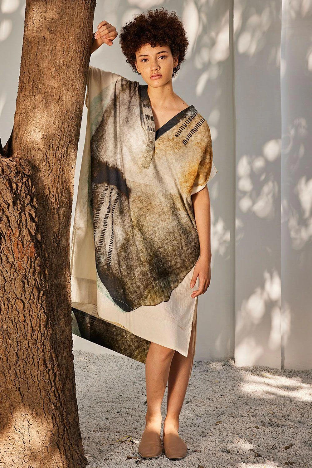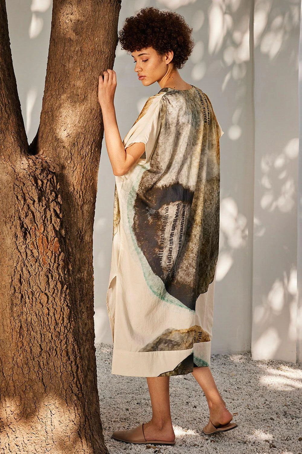 Elevate your summer style with this off-white mulmul cotton kaftan dress. Featuring a front button opening, side slit, and artful gathers at the shoulder, it’s the epitome of relaxed chic.