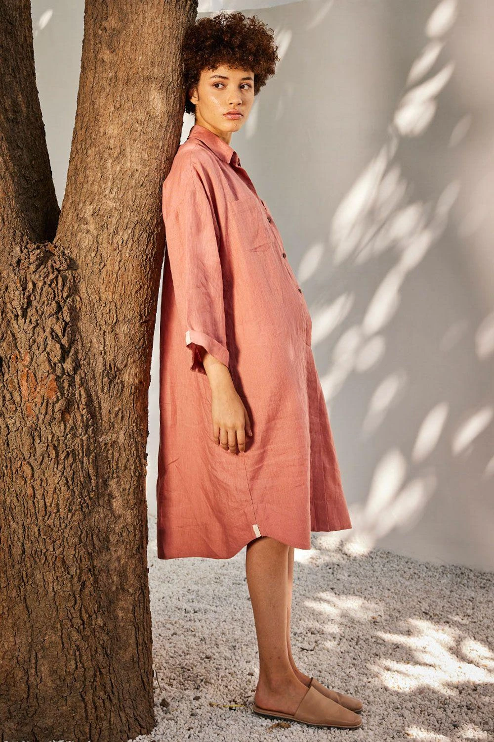 Elevate your wardrobe with this salmon pink linen shirt dress. Featuring a front button opening and elegantly folded sleeve hems, it’s a chic and versatile addition.