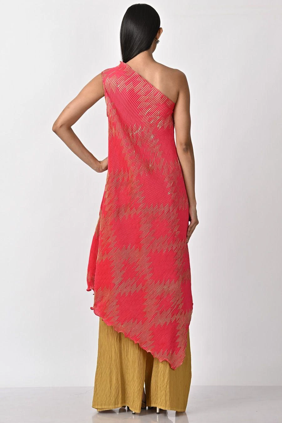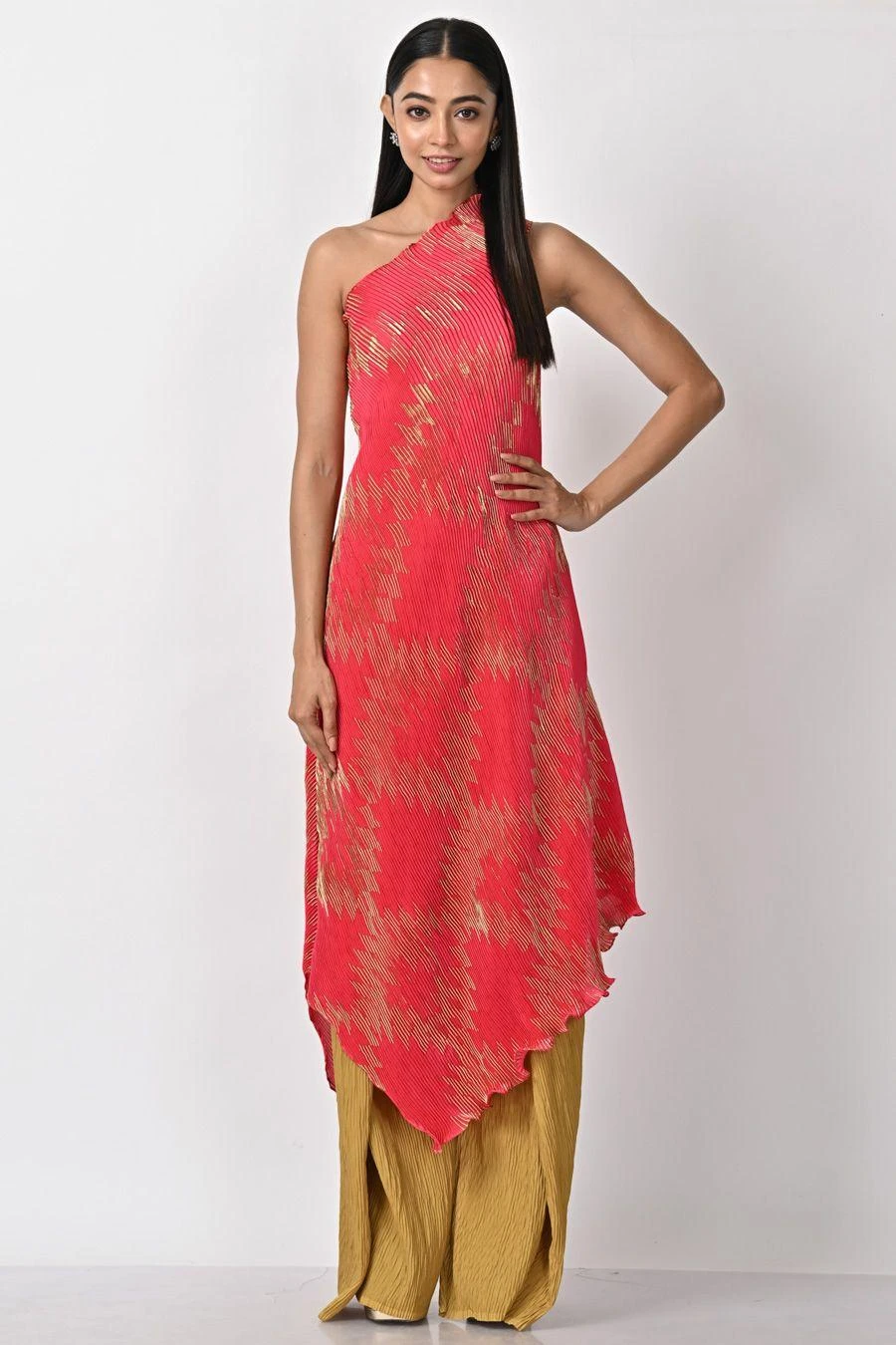 This fuchsia printed one shoulder dress will definitely fetch you a stand out look. This artistic creation is made in pleated polyester & is highlighted with embroidered details. Style this drape with a pair of dangler earrings to complete the look.