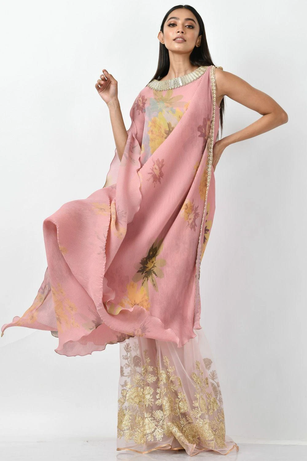 This elegant pink floral printed drape is embellished with tassels & embroidery details. Style this chic set with sharara pants for dressy daytime events.