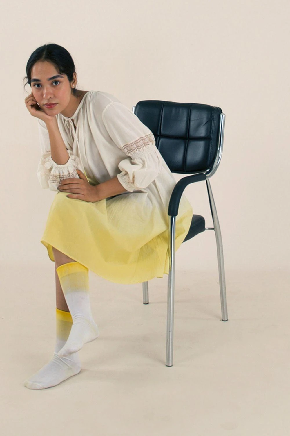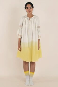 Immerse yourself in the essence of summer with this delightful semi-sheer neck-gathered mini dress. Featuring a charming tie-up closure and elasticated bubble sleeves adorned with delicate lace detailing, it exudes playful elegance.