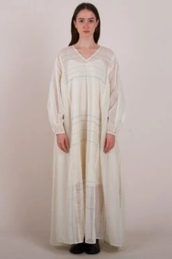 Step into the realm of sheer elegance with this semi-sheer dress. Adorned with gathered sides & bishop sleeves, it exudes a graceful charm. The intricate lace detailing adds a touch of refinement, while the side pockets offer convenience.