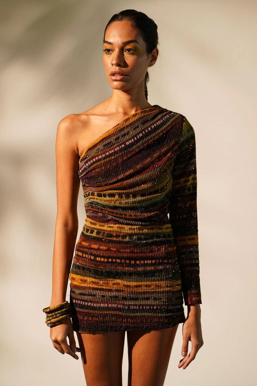 Add a layer of statement and glamour to your resort getaways with this brown dress. Crafted in sequin pure georgette, this one shoulder short dress features striped details all over. Add a pair of dangler earrings to complete the look.
