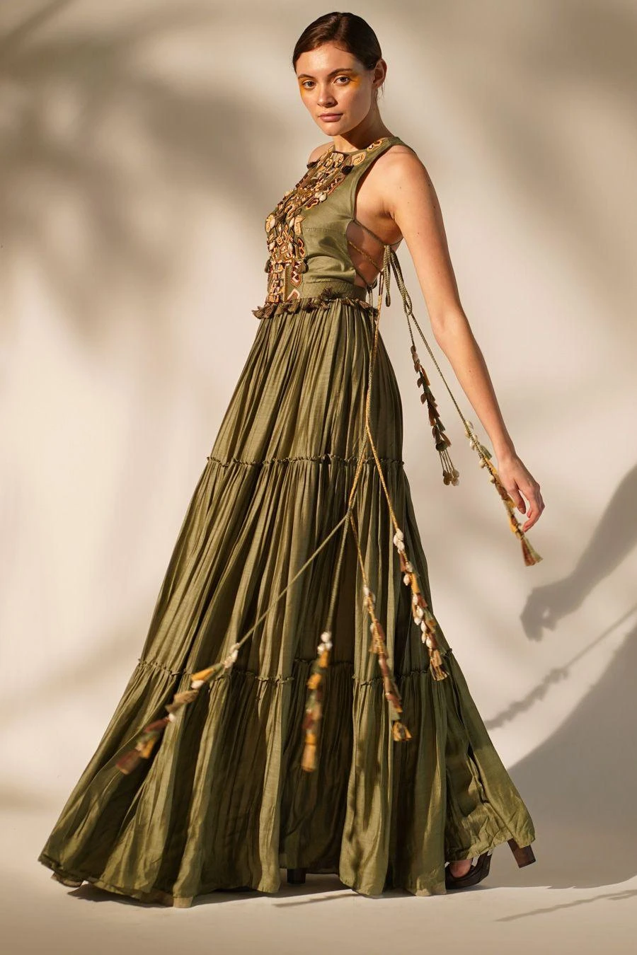 Add a layer of statement and glamour to your resort getaways with this olive green dress. Crafted in mul silk, this halter neck maxi dress features hand done thread & wooden embellishments.