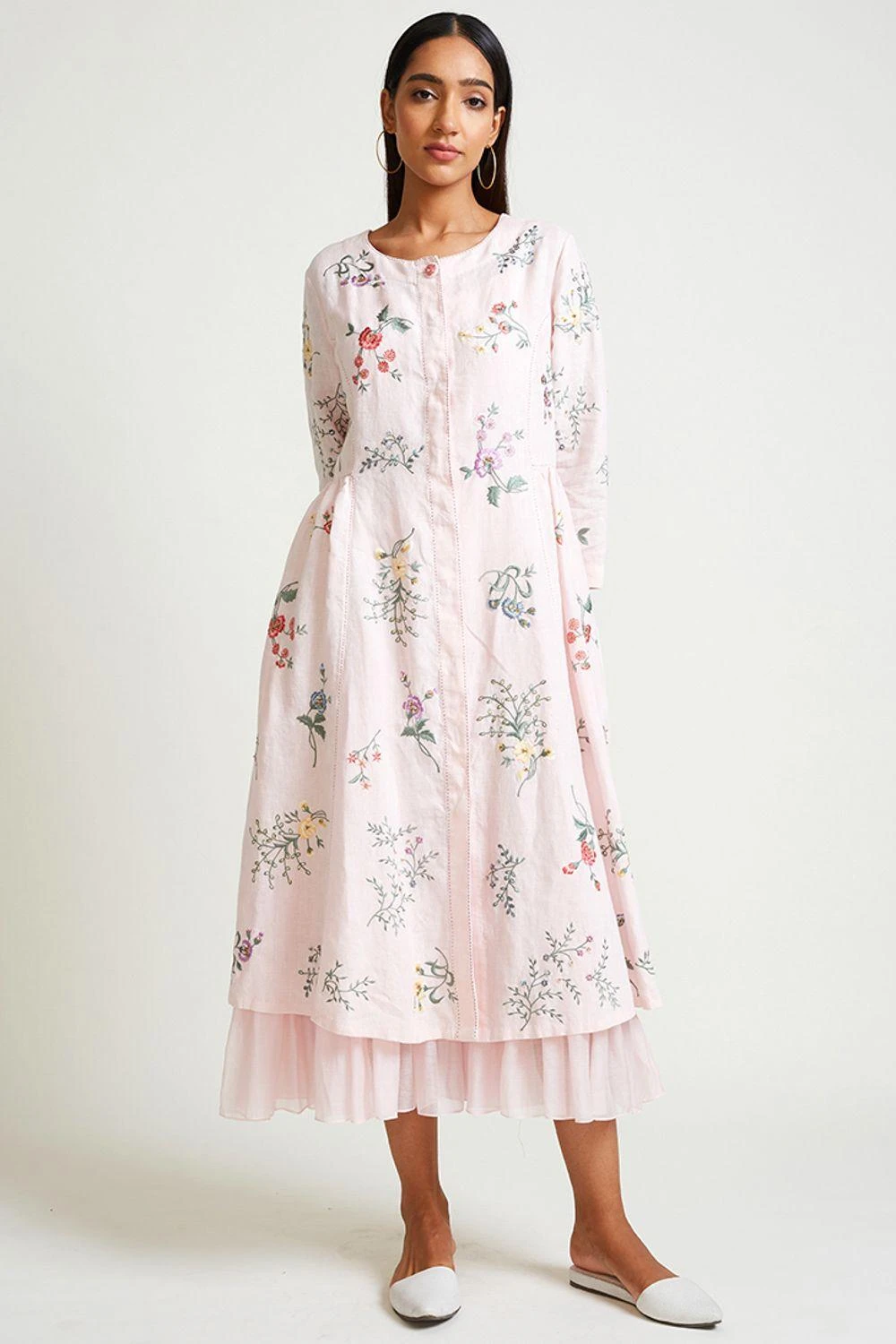 Set in breathable linen, this pink midi dress features a round neck & quarter sleeves. It is enhanced with intricate multicoloured bouquet embroidery. It comes with a frill inner slip. Style this elegant piece with a pair of gold hoops & chic flats.