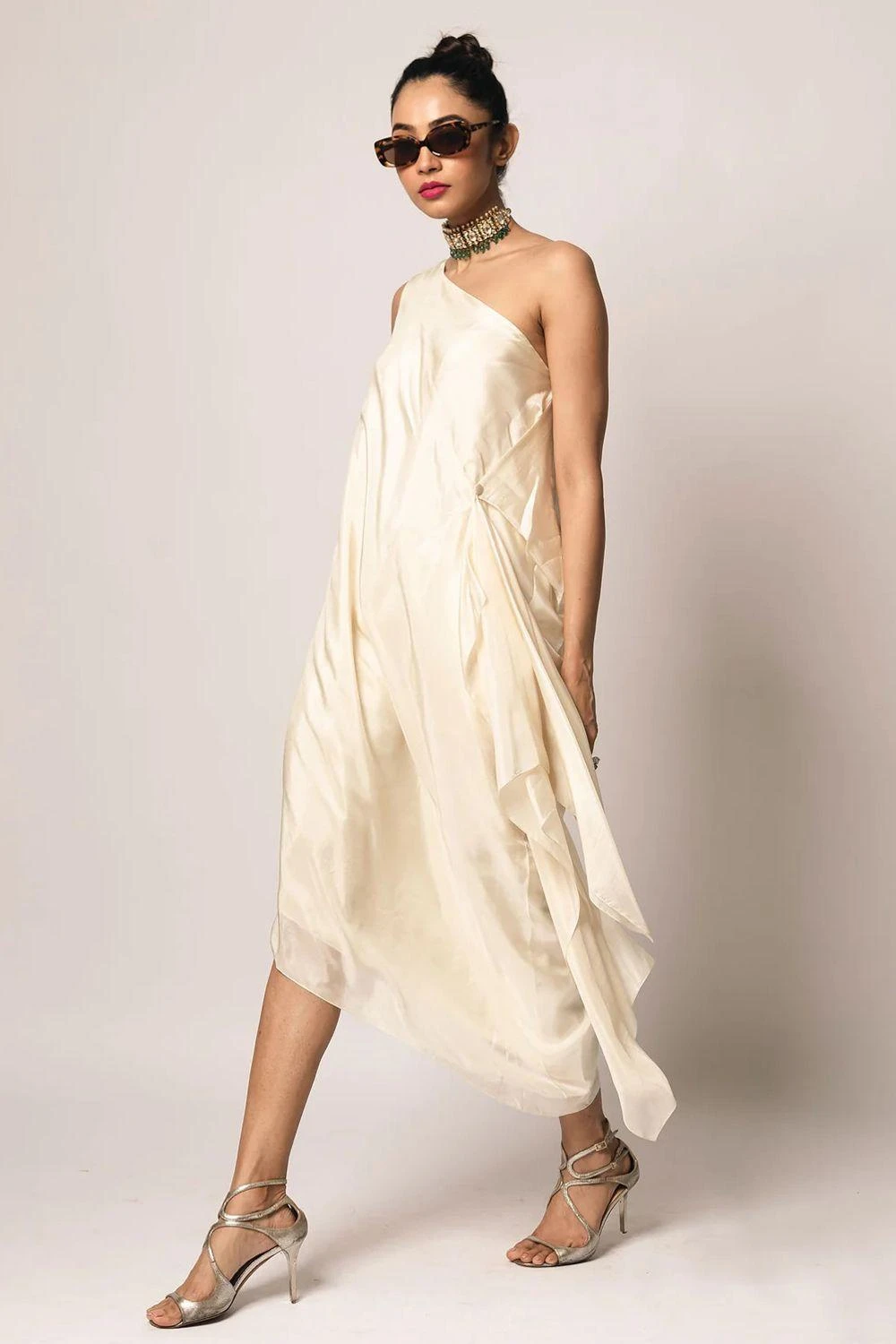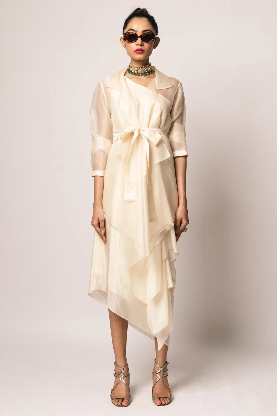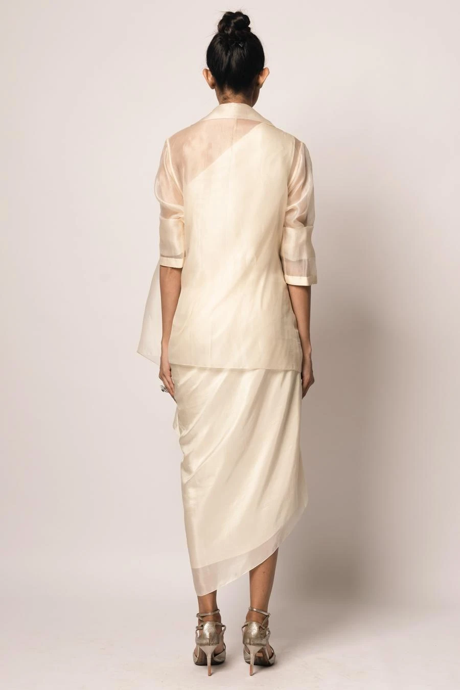 This dress set falls in the realm of luxe minimalism. Crafted in silk organza, this set features a one-shoulder dress with a knotted detail at the side paired with a long deconstructed shirt. Add a pair of gold hoops to complete the look.
