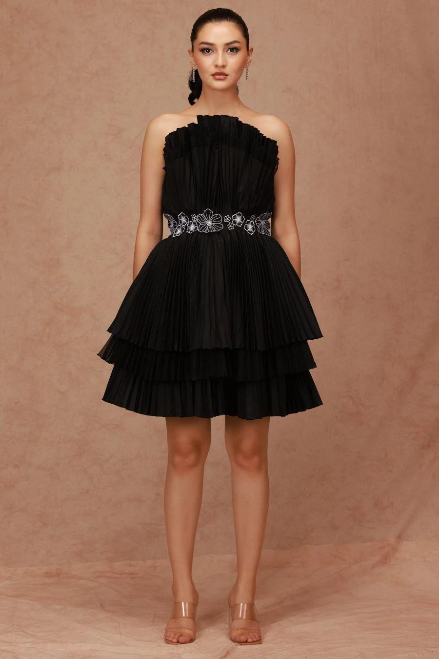 Look effortlessly stylish in this black dress. This pre-pleated cabbage dress is created on an organza base with ruffles, cinched at the waist with a floral appliqued belt. Add a pair of statement earrings to complete the look.