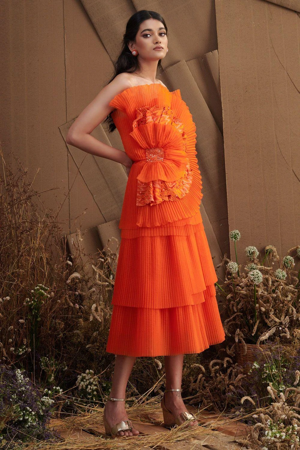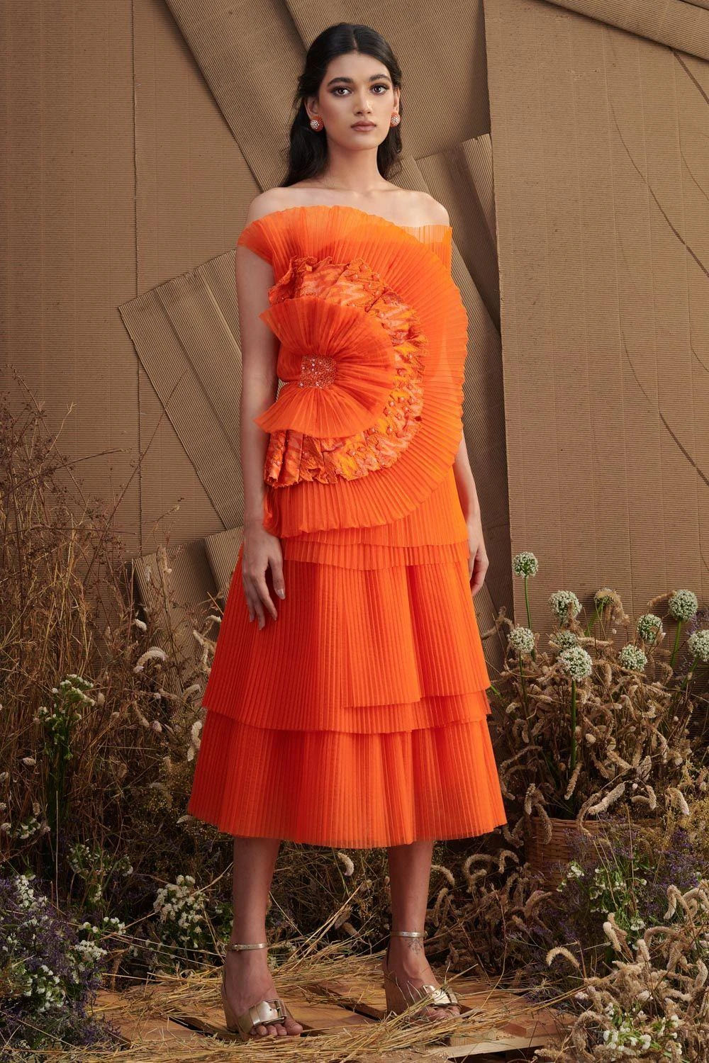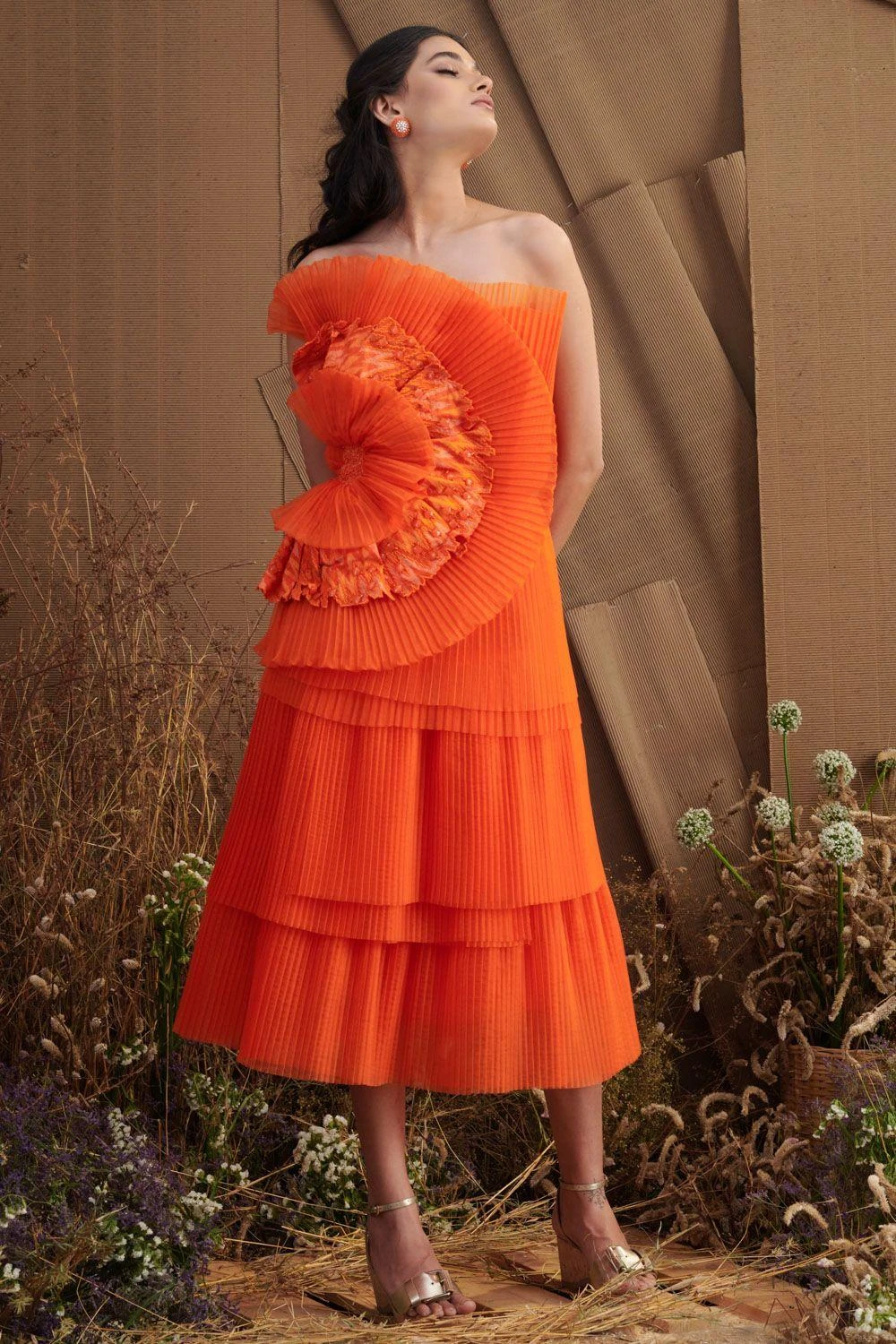 This statement pre pleated large 3D floral midi dress is set in an orange organza. Style this with diamond earrings & a delicate necklace for a daytime soiree.