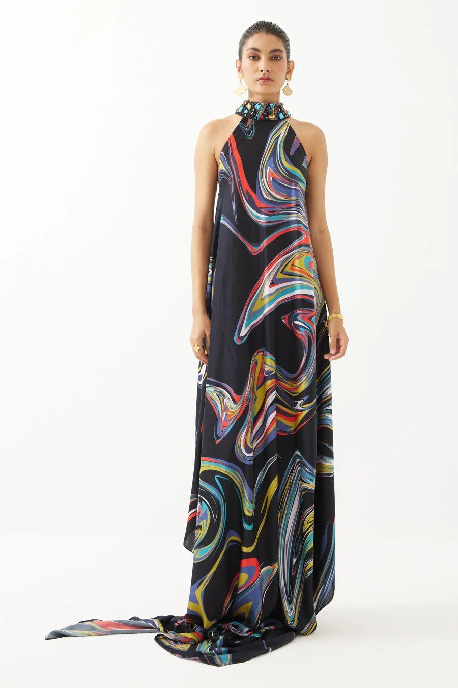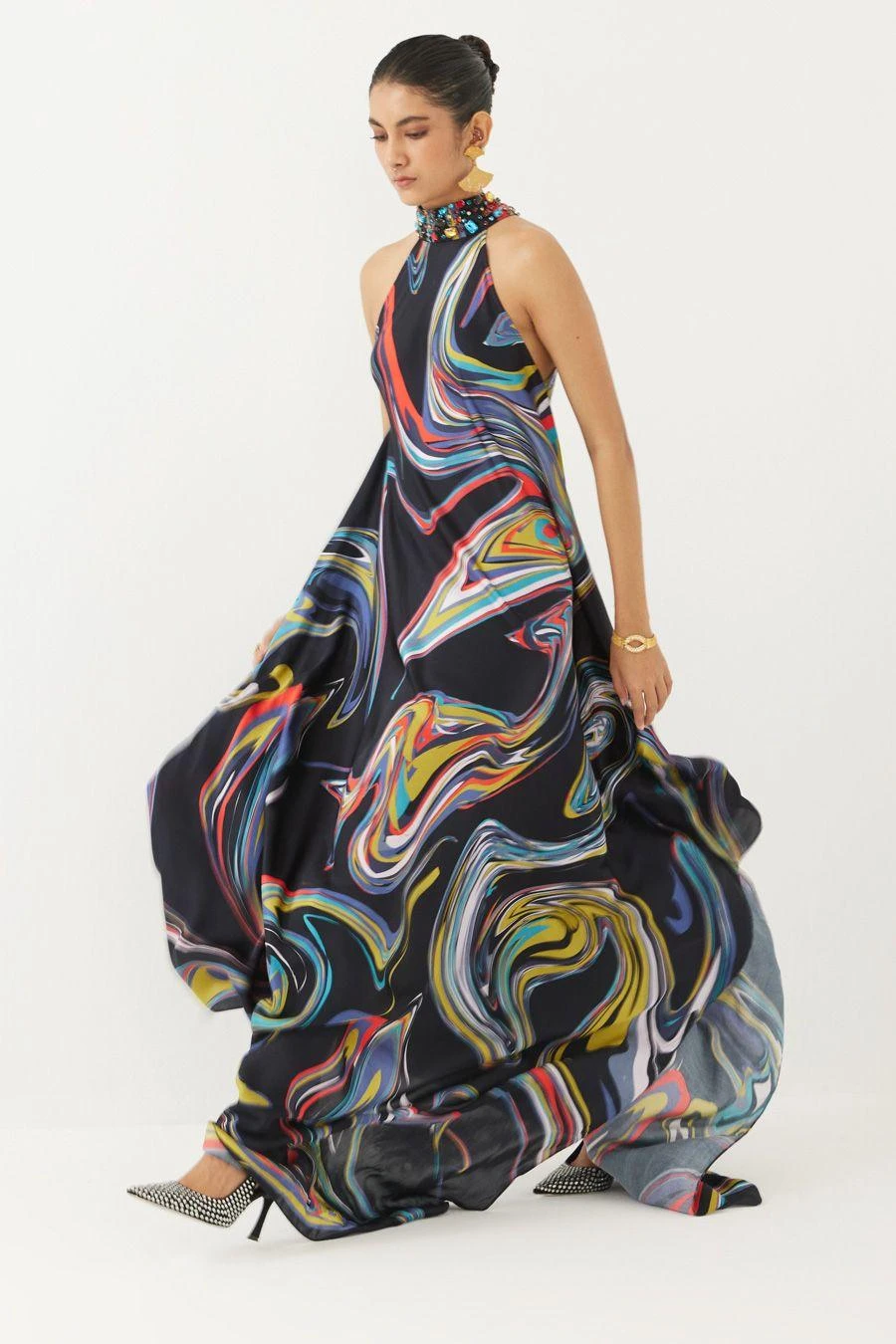 Crafted in began silk, this halter neck dress features an embroidered Swarovski collar. Made in a combination of three hues this stunning hand painted galaxy print dress is a trend setting piece.