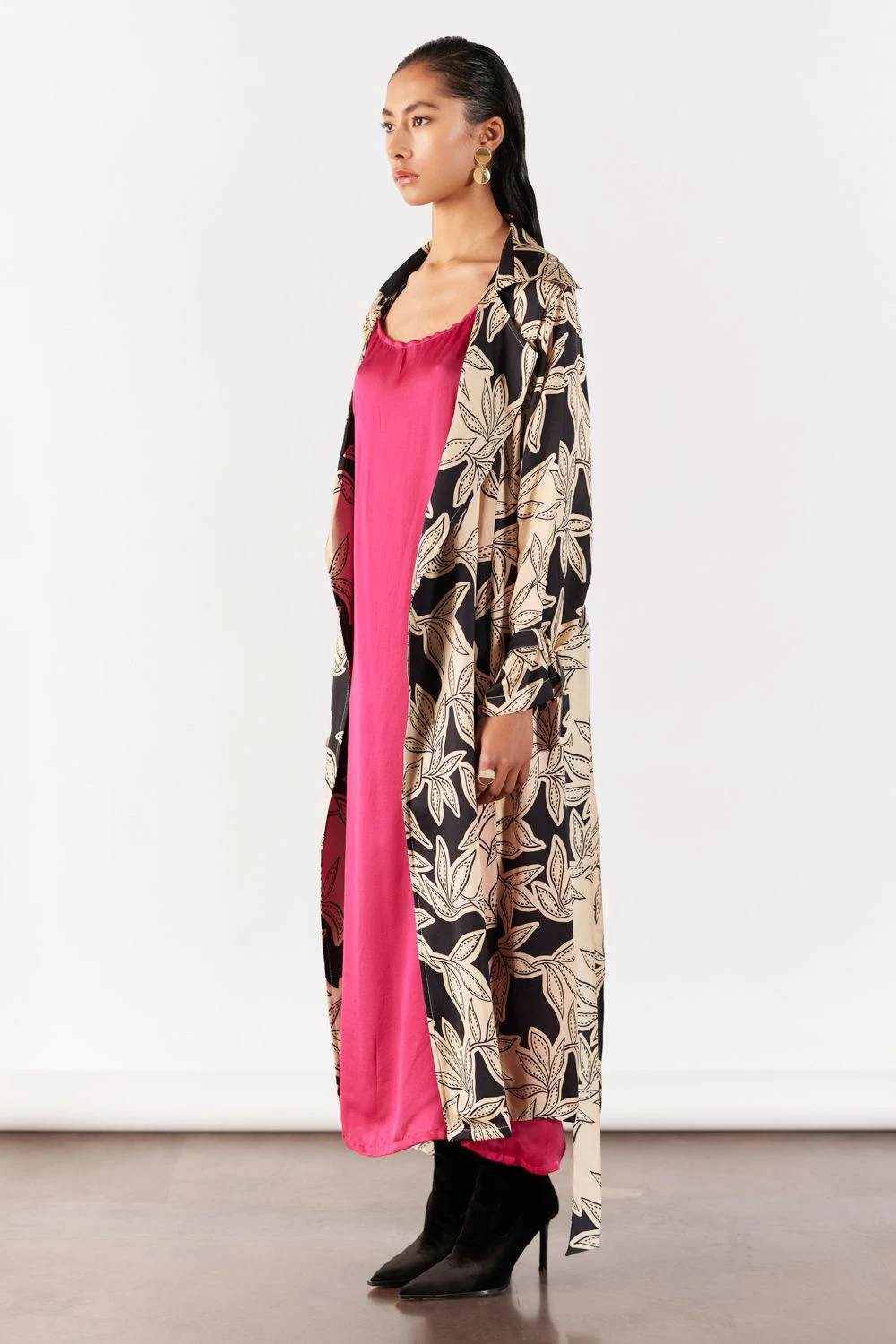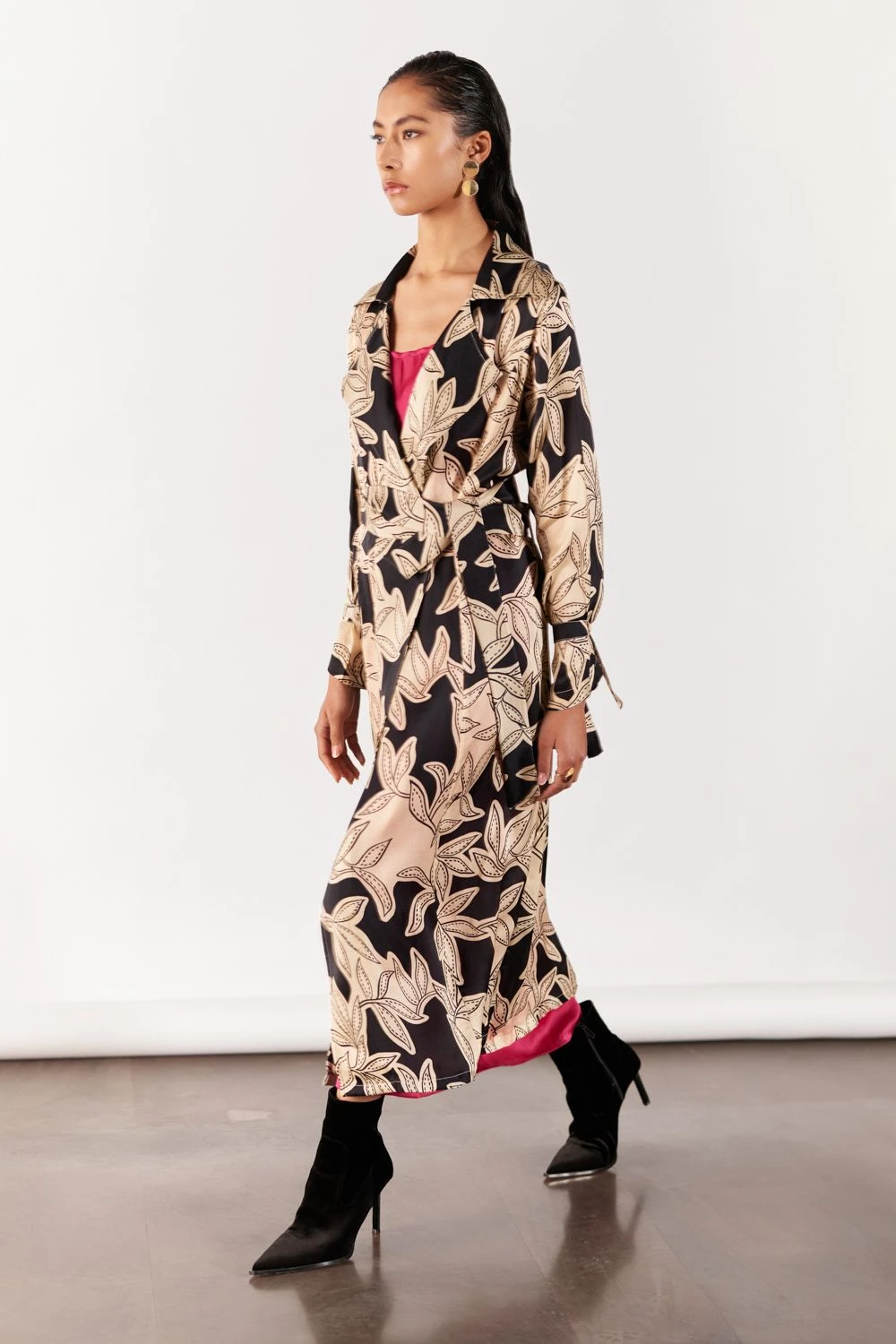 Unveil elegance in the vegan silk Hazel Trench Coat & Slip Dress. A captivating duo in hand-drawn Hazel print, exuding elegance. The trench, with a straight fit, boasts sleeve belt details & a waist belt. Perfect with heels for an exquisite allure.