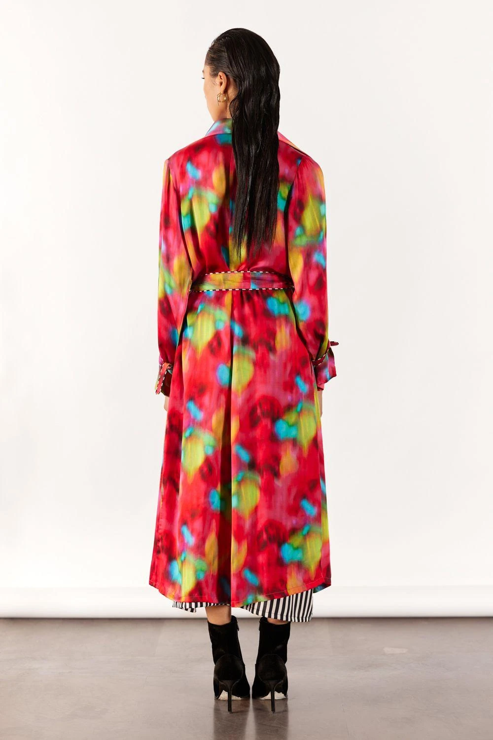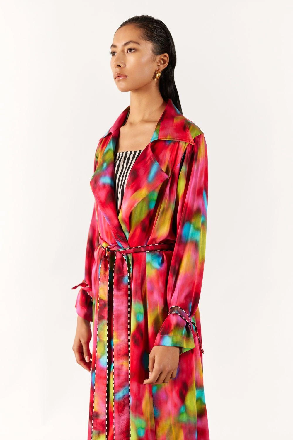 A two-piece set entailing the poppy trench coat & a striped slip dress, crafted from vegan silk, features a blurry poppy print & a chic contrast-striped strappy slip. The trench, with belted sleeve details & a waist belt, exudes elegance.