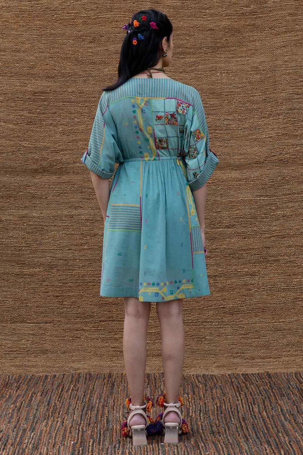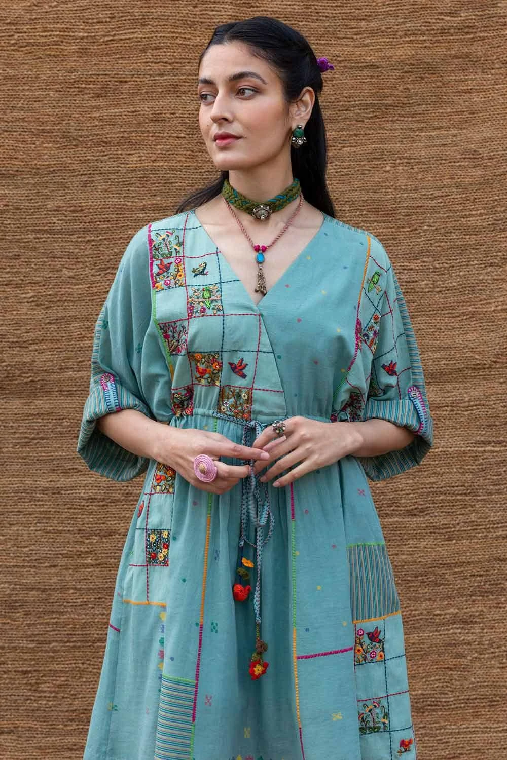 Welcome spring in style & comfort with this breezy blue dress in muslin textile. It features a wide overlap neck detail with gathers at the waist, featuring a drawstring. The intricate thread embroidery adds a vibrant touch to it.