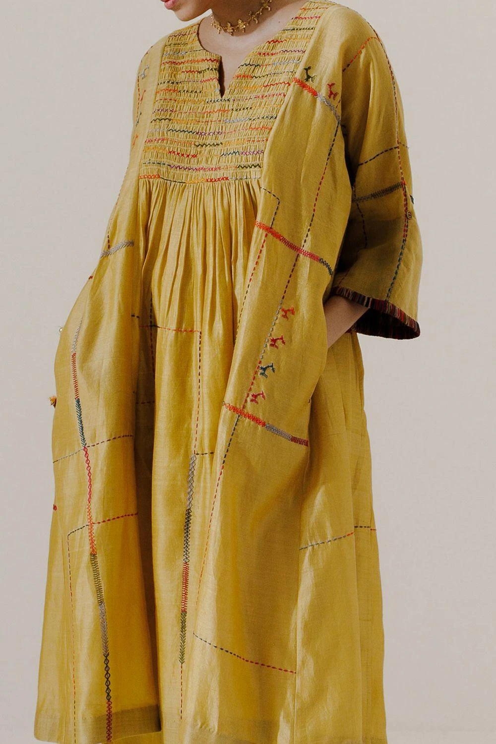 Whether you are lounging at home, vacationing, or dressing for the office, this kurta can feel both casual & dressed up. It features a smoked yoke, kimono style sleeves & minimal embroidery. Style it with a stack of bracelets to complete the look.