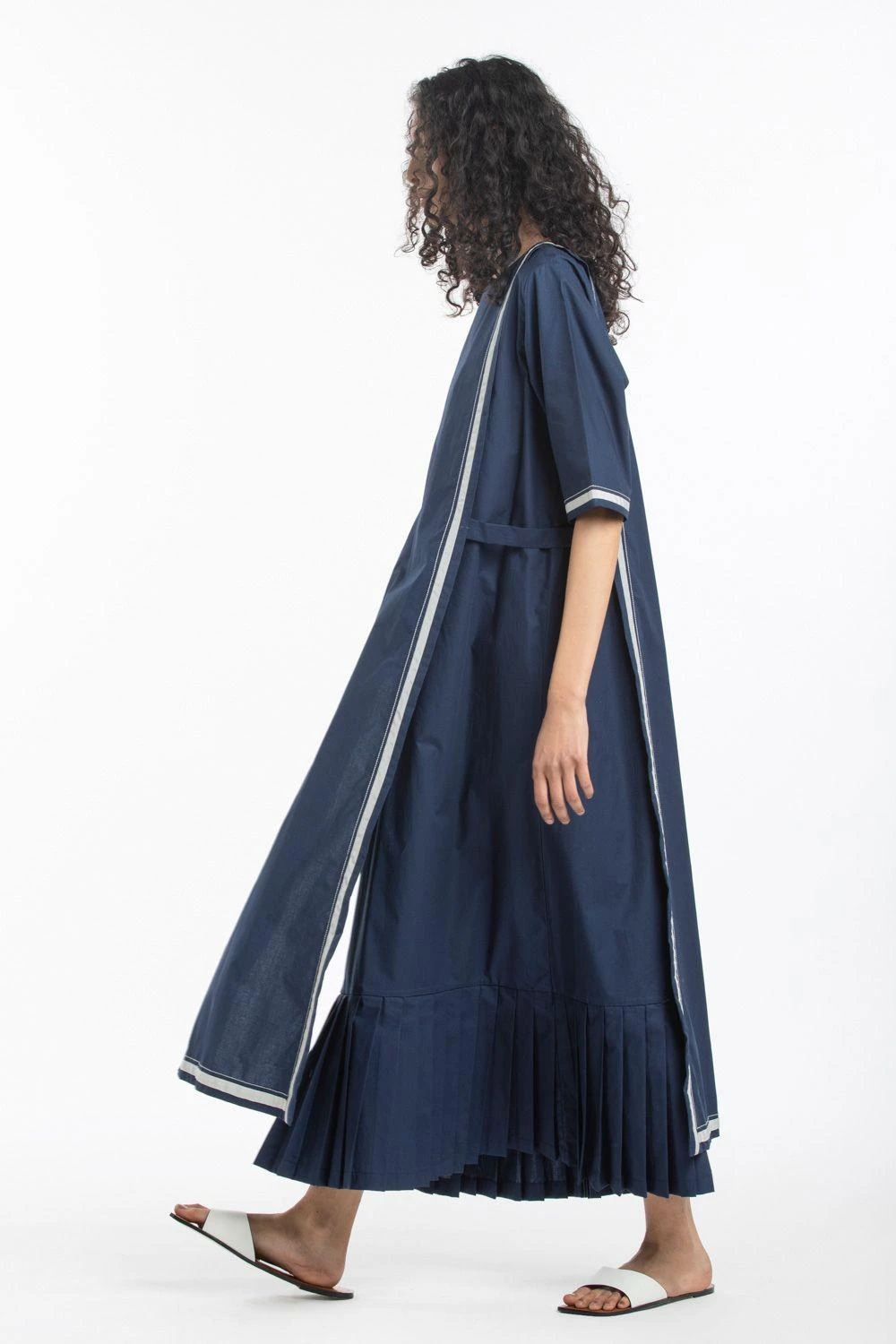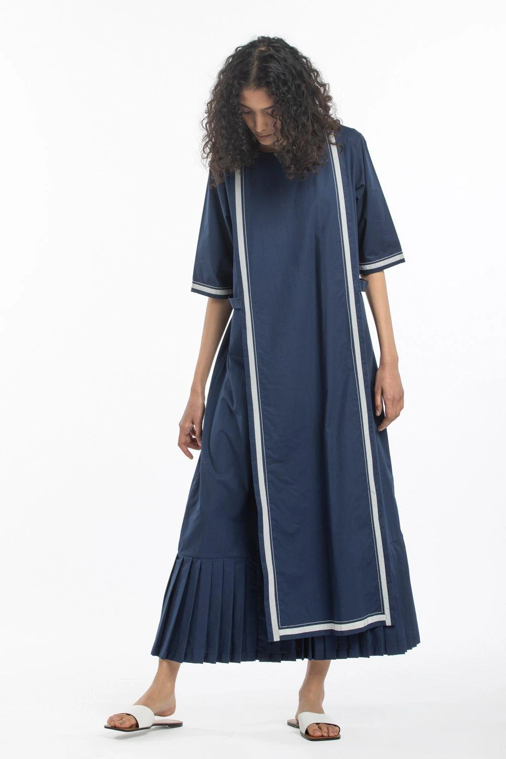 This cotton poplin dress is cut in a unique silhouette with front panels and bottom pleats detailing. It is woven in crisp cotton poplin in a relaxed silhouette. You can style it with chic flats and oxidised silver studs for an edgy look.