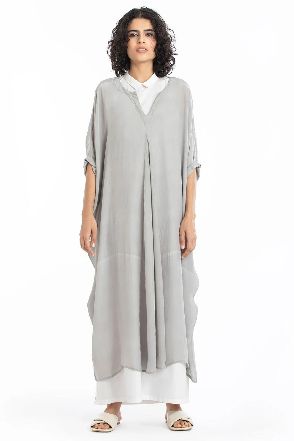 This V neck kaftan in grey comes with a placket white dress inside. The subtle color play of grey and white make this combination perfect for your summer sojourns!