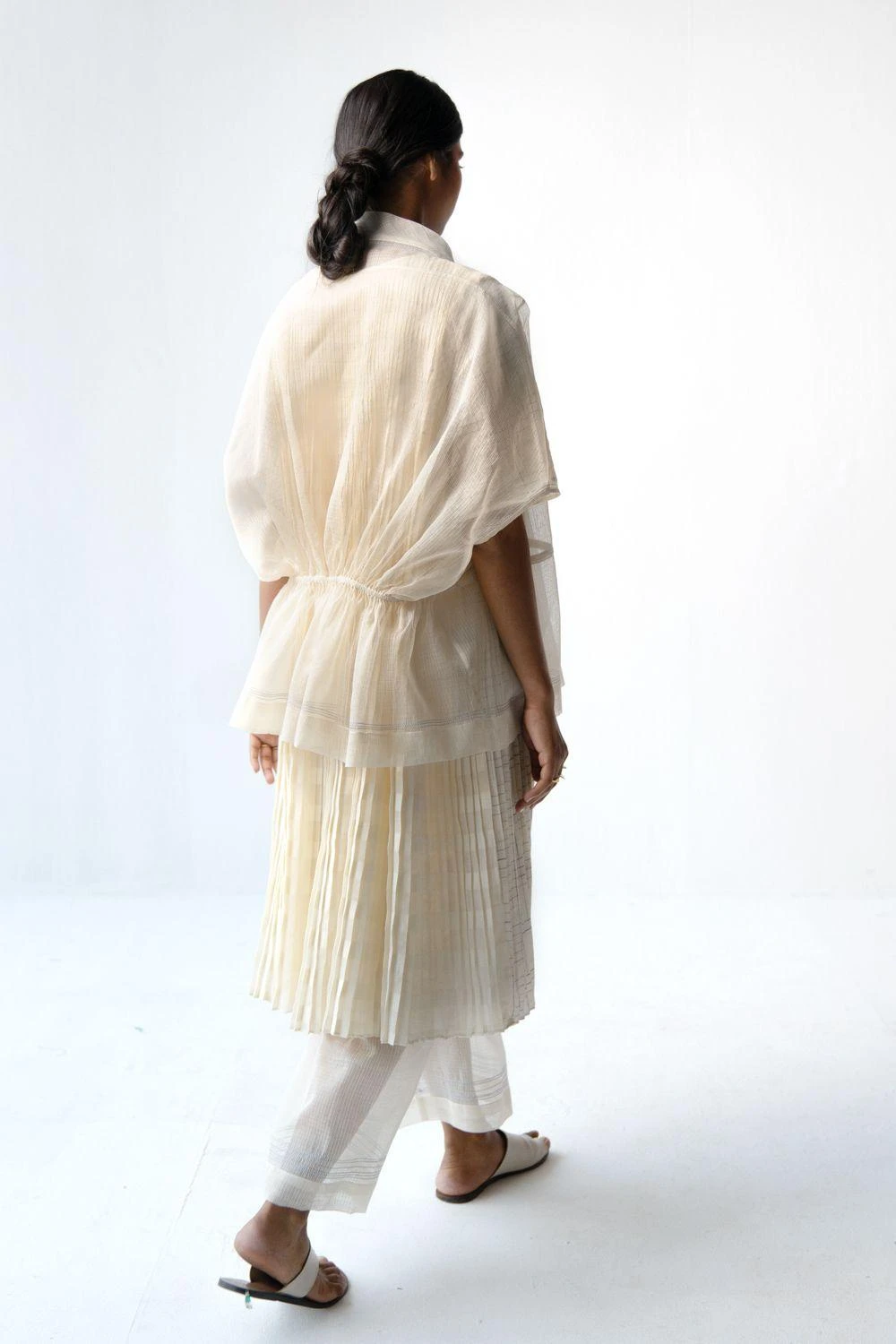 This checkered panelled dress is a multi-season pick, suiting a minimal yet opulent taste. It is woven in cotton with micro pleating technique, enhanced with kantha details. Pair it with linen pants and a coordinating jacket for a tasteful look.