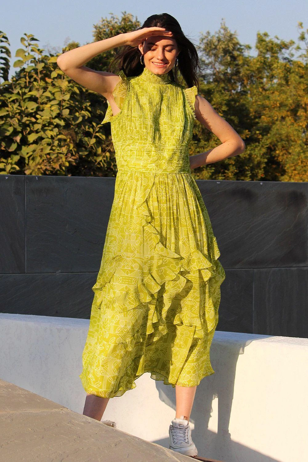This lime green ruffle dress tastes like summer. It is cut georgette and enhanced with smocked detailing with ruffles & gathers. Style this piece with a pair of bold golden hoops and heels.