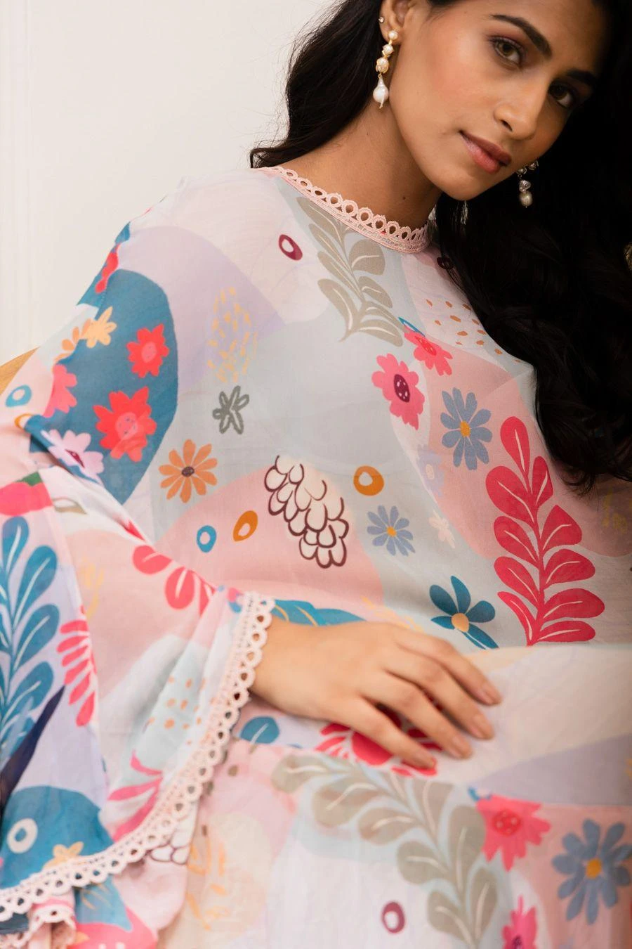 Add a layer of style & glamour to your resort getaways with this cape style dress. Crafted in georgette, this dress features a floral print with ruffles & lace detailing along the neckline and edgings.
