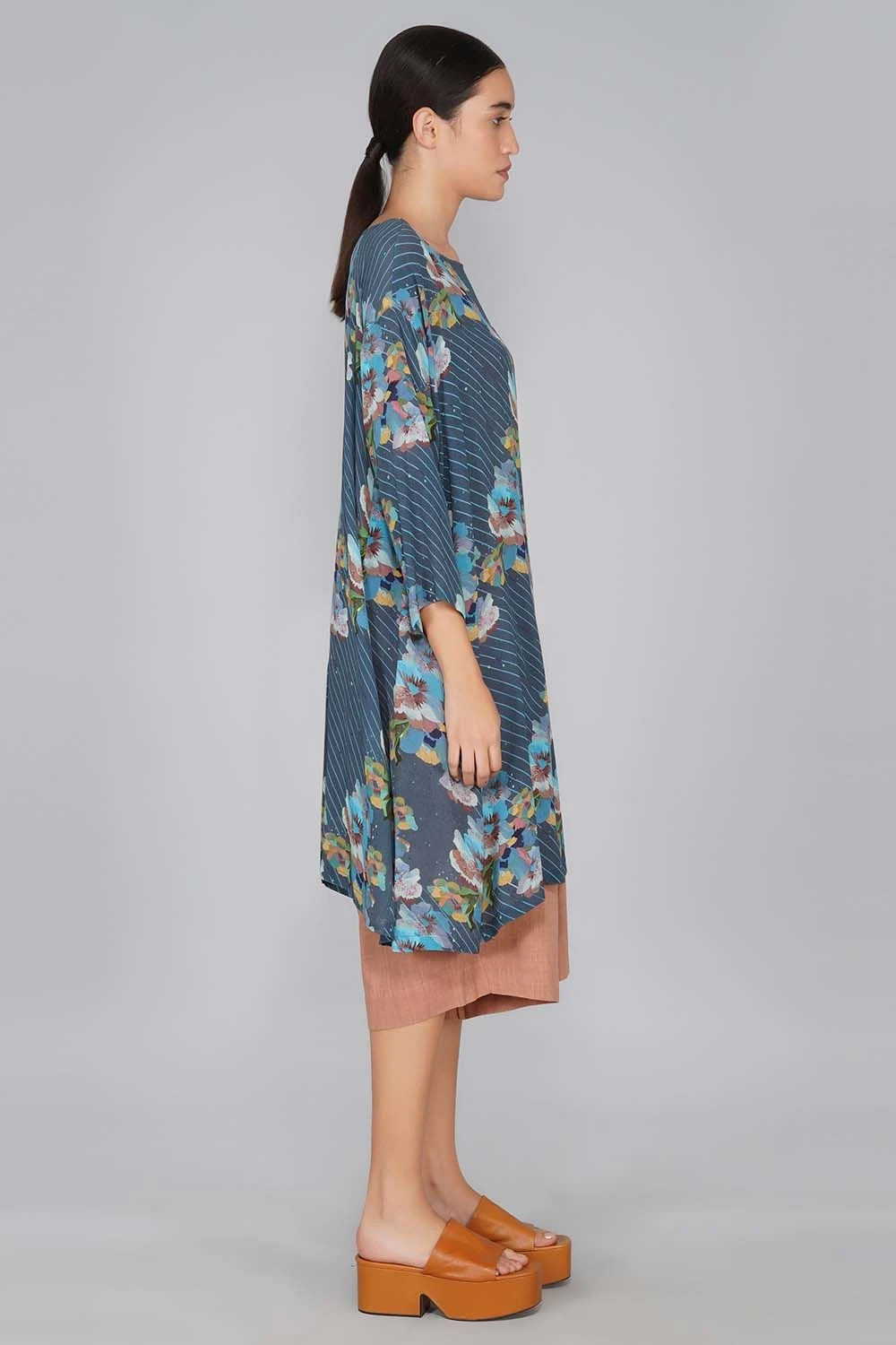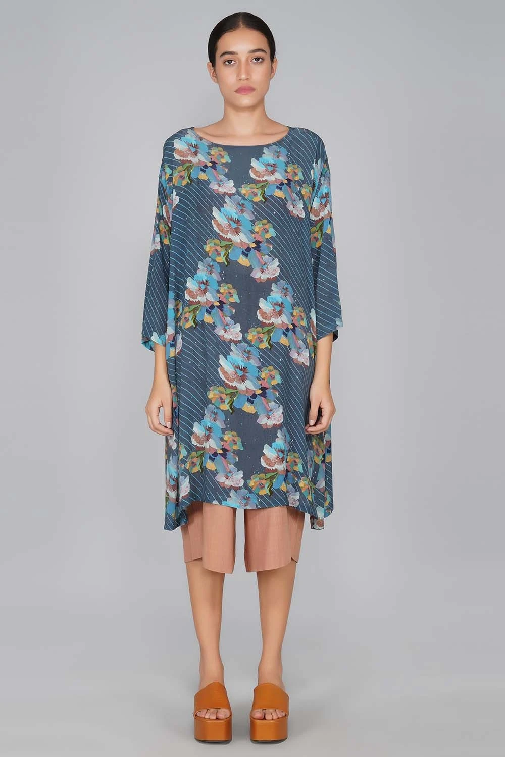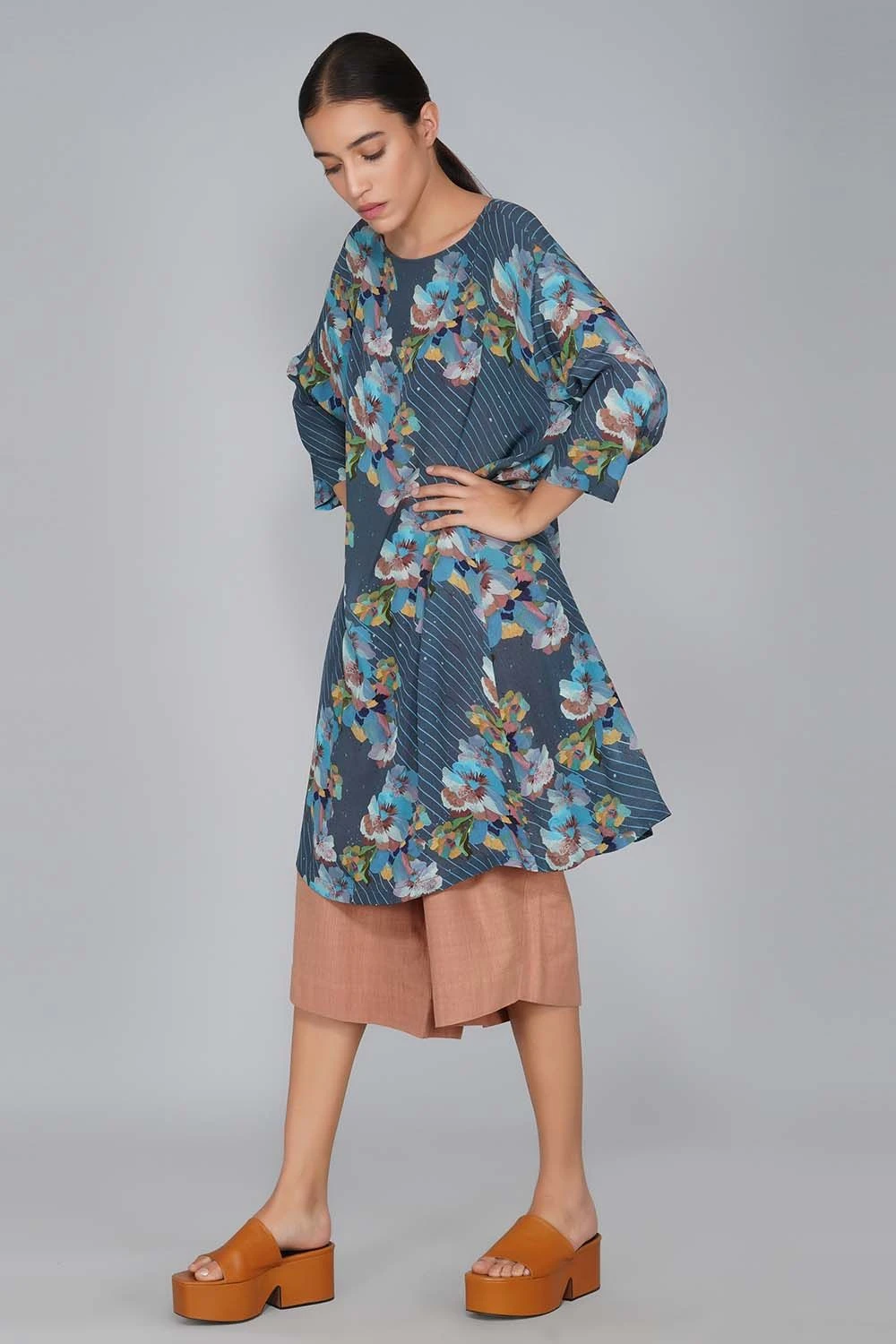 This finely tailored dress is made in 100% cotton. It is orchestrated in a subtle handkerchief cut in a flowing silhouette. The polychromatic prints in vivacious tones catch the attention. It can be worn solo as a dress or can be paired with pants.