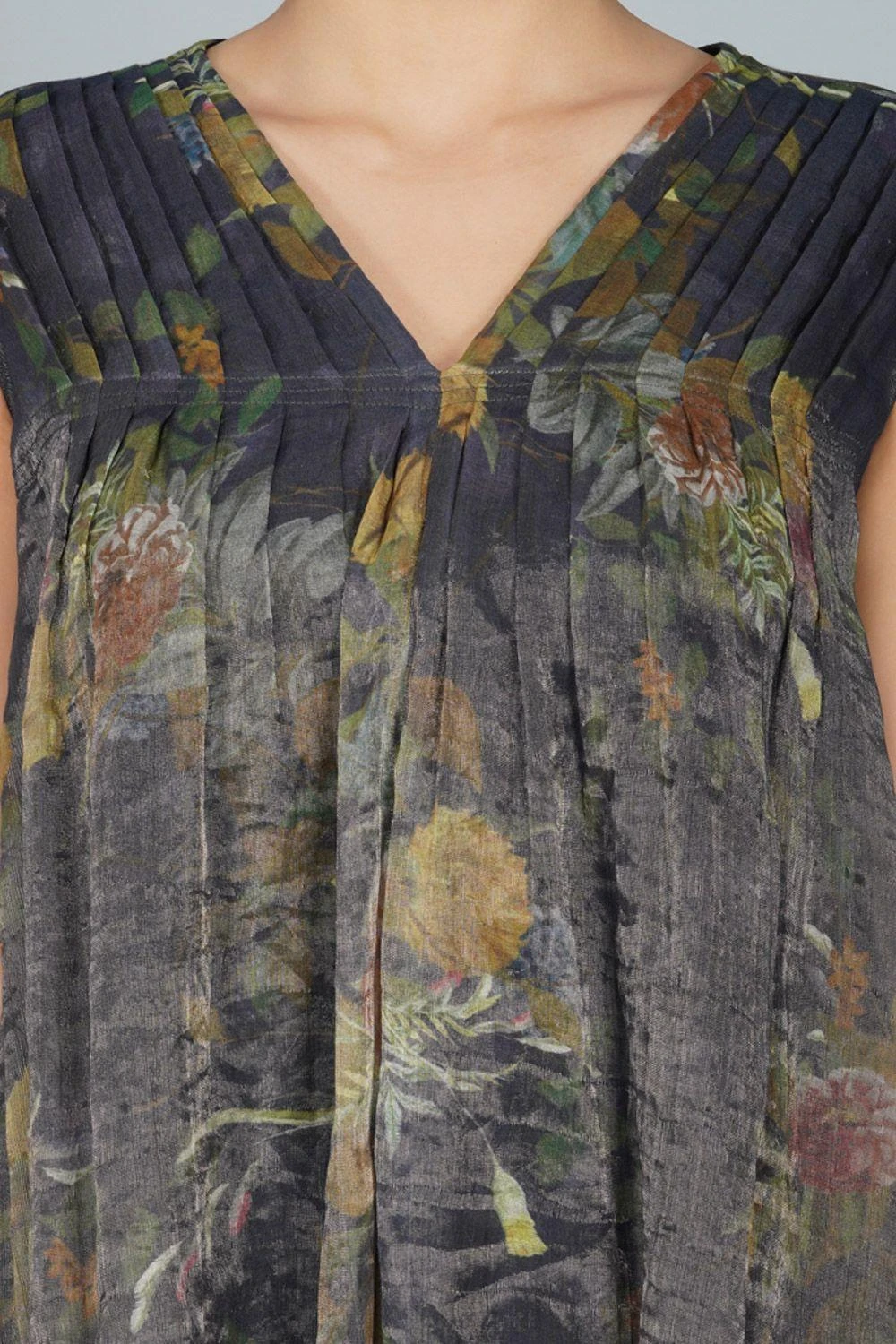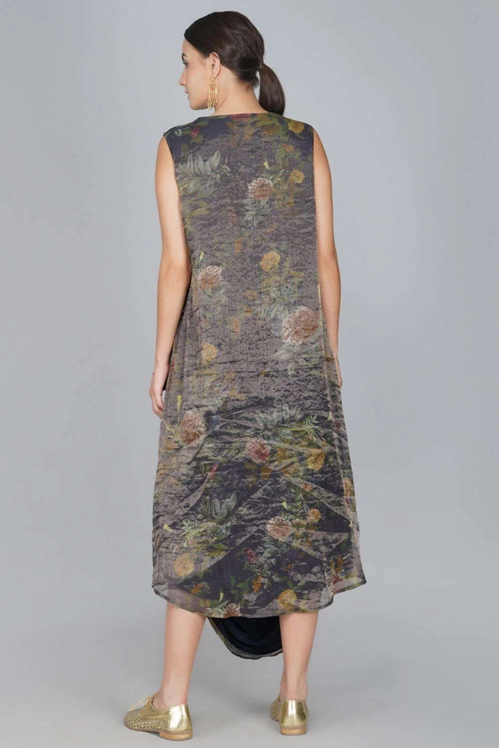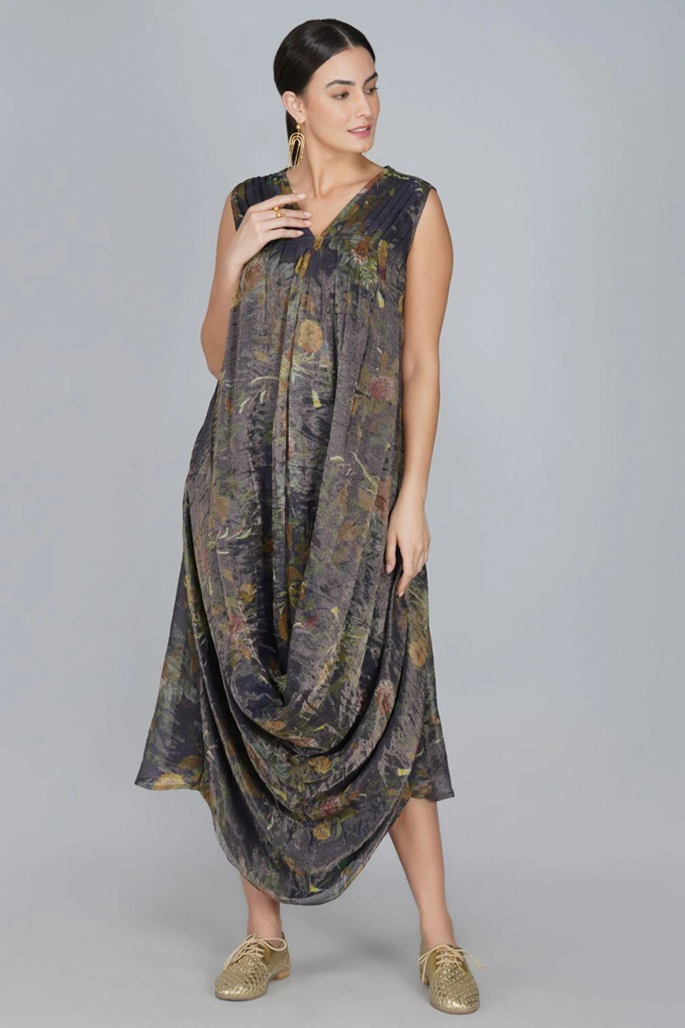 Yavi beautifully blends the elegant florals with handwoven zari tissue into this beautiful drape dress. Its cascading silhouette is a perfect blend of luxury & comfort. You can add a pair of statement earrings and heels.
